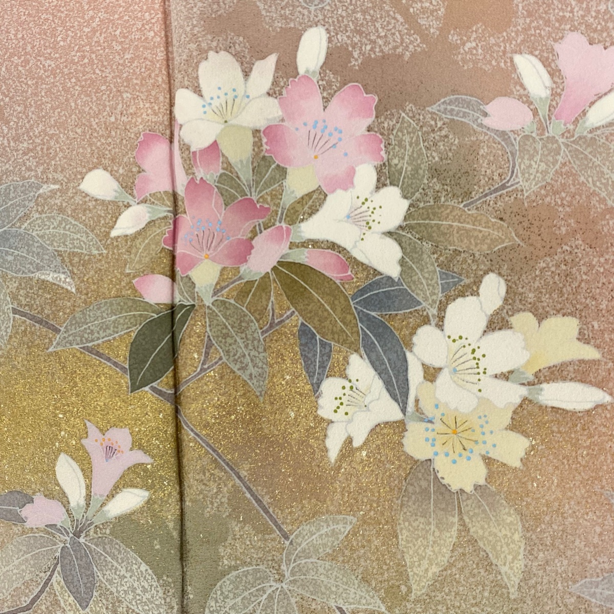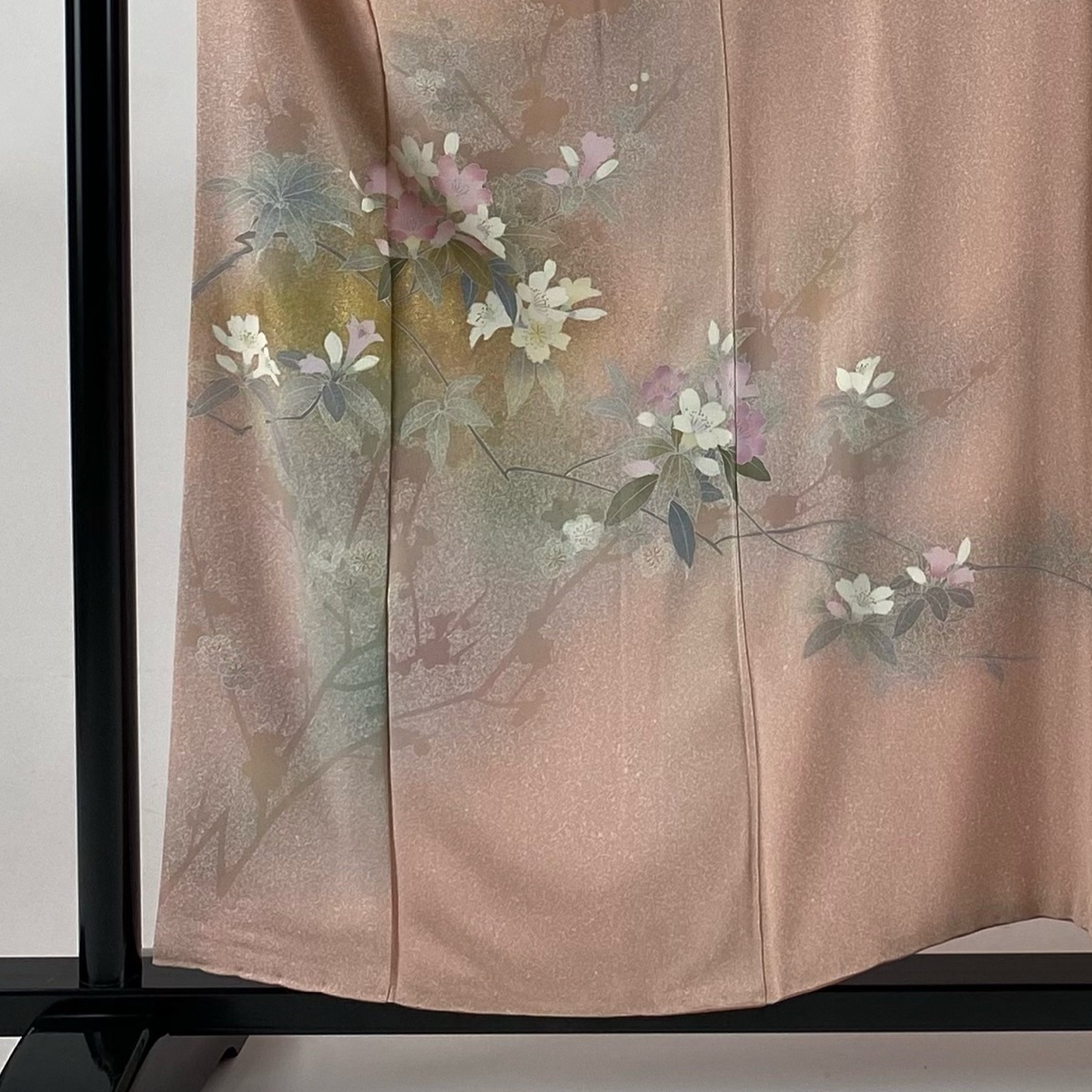 | 訪問着 秀品 枝花 シルエット 金彩 ぼかし サーモンピンク 袷 身丈156 裄丈64 M 正絹 【中古】 |