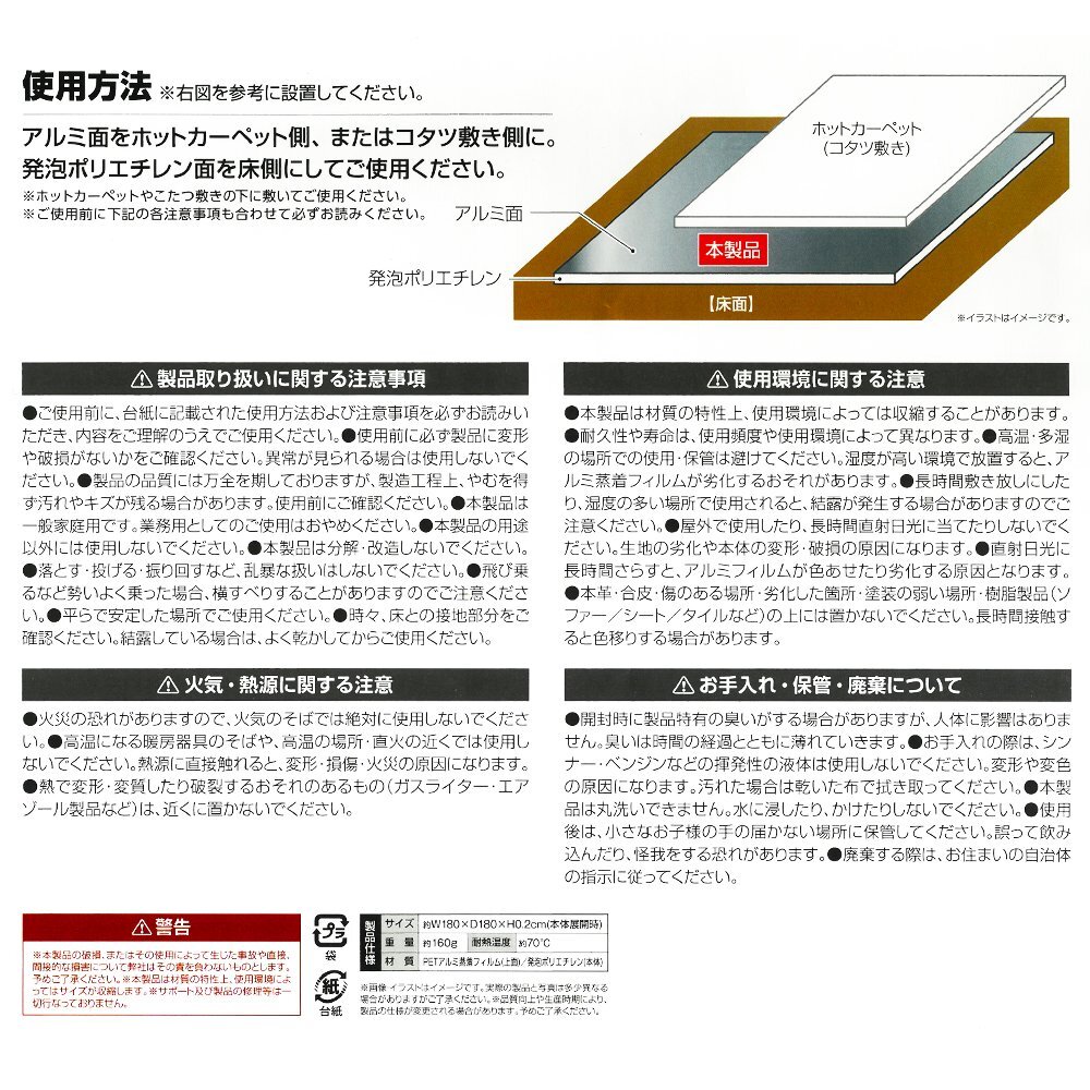 | ※ホットカーペットやこたつ敷きの下に敷いてご使用ください。 ※本革・合皮・傷のある場所・劣化した箇所・塗装の弱い場所・樹脂製品(ソファー、シート、タイルなど)の上には置かないでください。 ※本製品は丸洗いできません。 ・掲載画像はイメージであり、実際の製品とは多少異なる場合があります。 ・パッケージや個装形態は入荷時期によって変更となる場合があります。 ・製品の仕様は品質の向上・改善のため、予告なく変更となる場合があります。 |