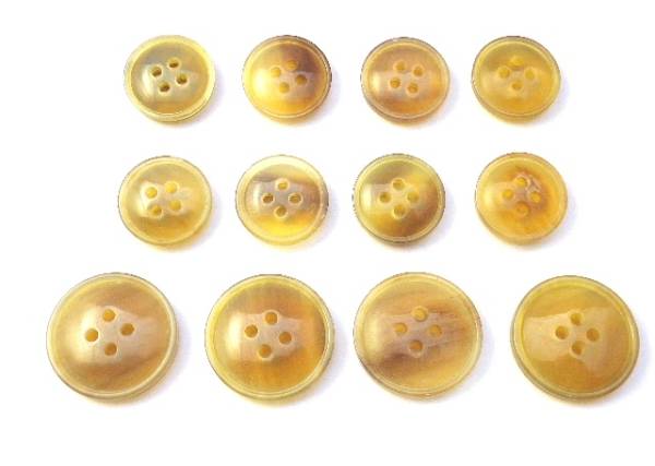 | 本水牛ボタン、ツヤ有りのベージュ色です 水牛ボタンのベージュ色は、ほとんど採れず、 たいへん貴重とされております。 色、サイズ色々ございますので 「水牛 ボタン 994」で検索してください。 袖口用15mm8個 前身20mm4個のたいへんお得なセット でご提供いたします。 お手持ちのスーツのボタンを変えてみてはいかがですか? ガラリと雰囲気が変わりますよ。 また水牛釦は、機械でつくらず、 水牛の角を1つ1つ輪切りにし、それを丸い形にくり抜き、 手作業で、加工し型付けをし、バリなどをとり、ツヤ加工いたします。 そりゆえ高級な服にしか付けることができません。 | ||