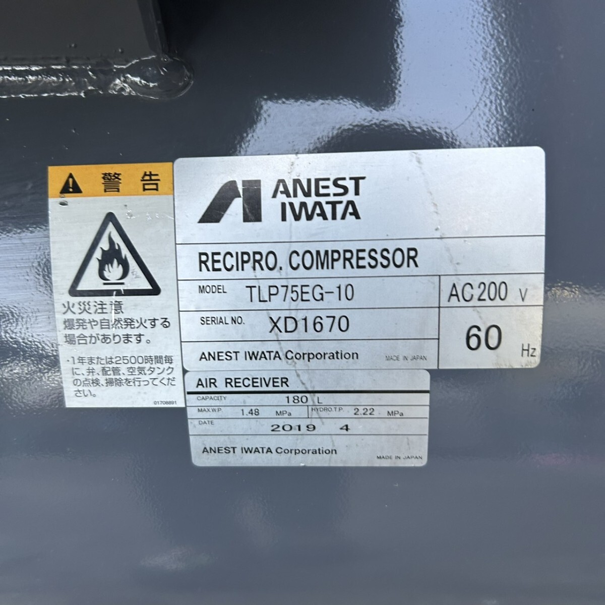 アネスト岩田 TLP75EG-10 レシプロコンプレッサー 2019年製 給油式 60Hz 7.5kw 10馬力 三相200V 動作確認済み パレット発送