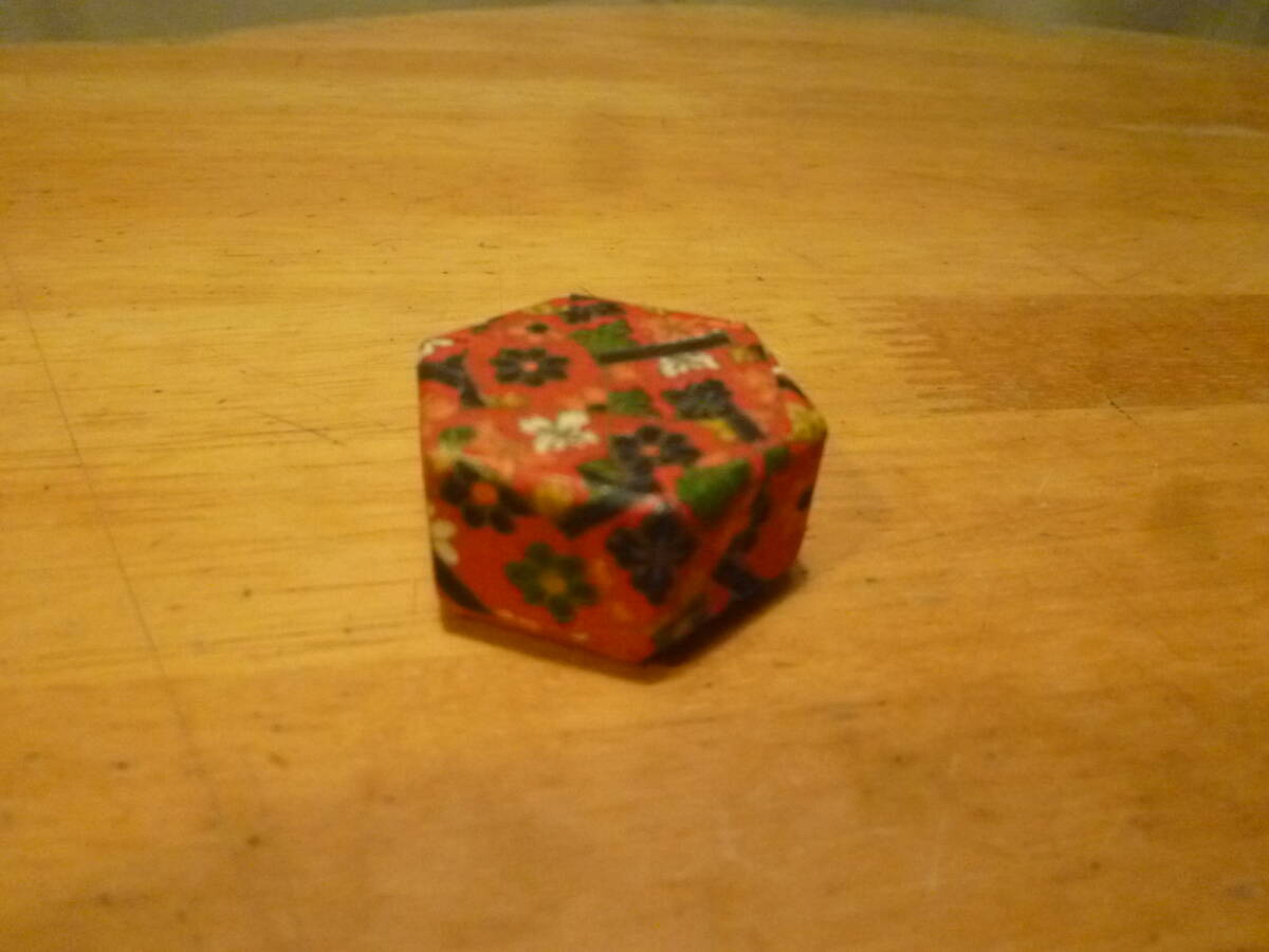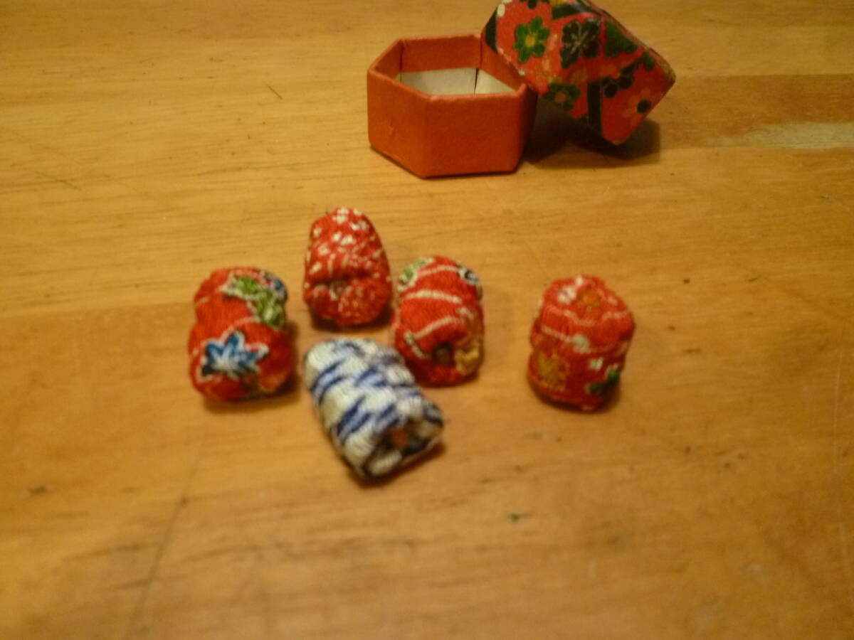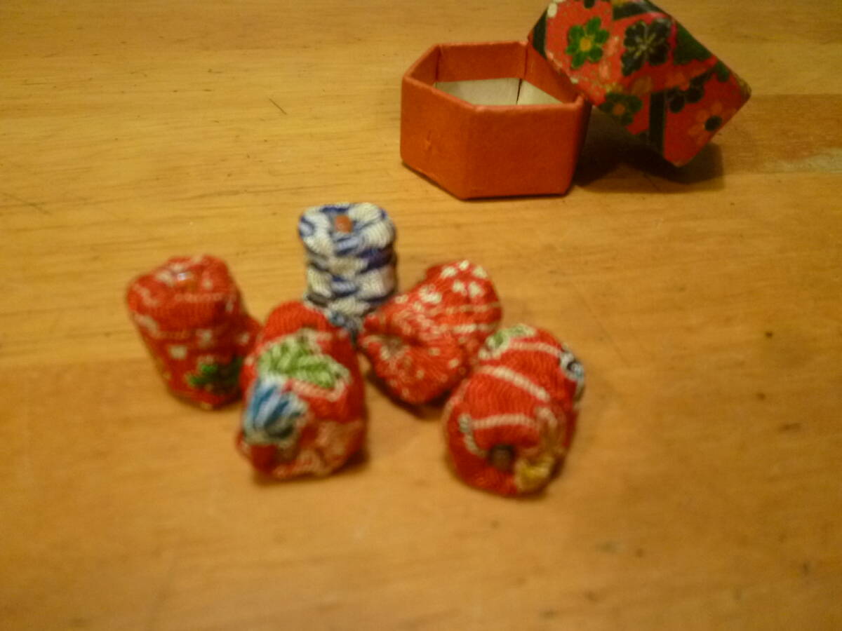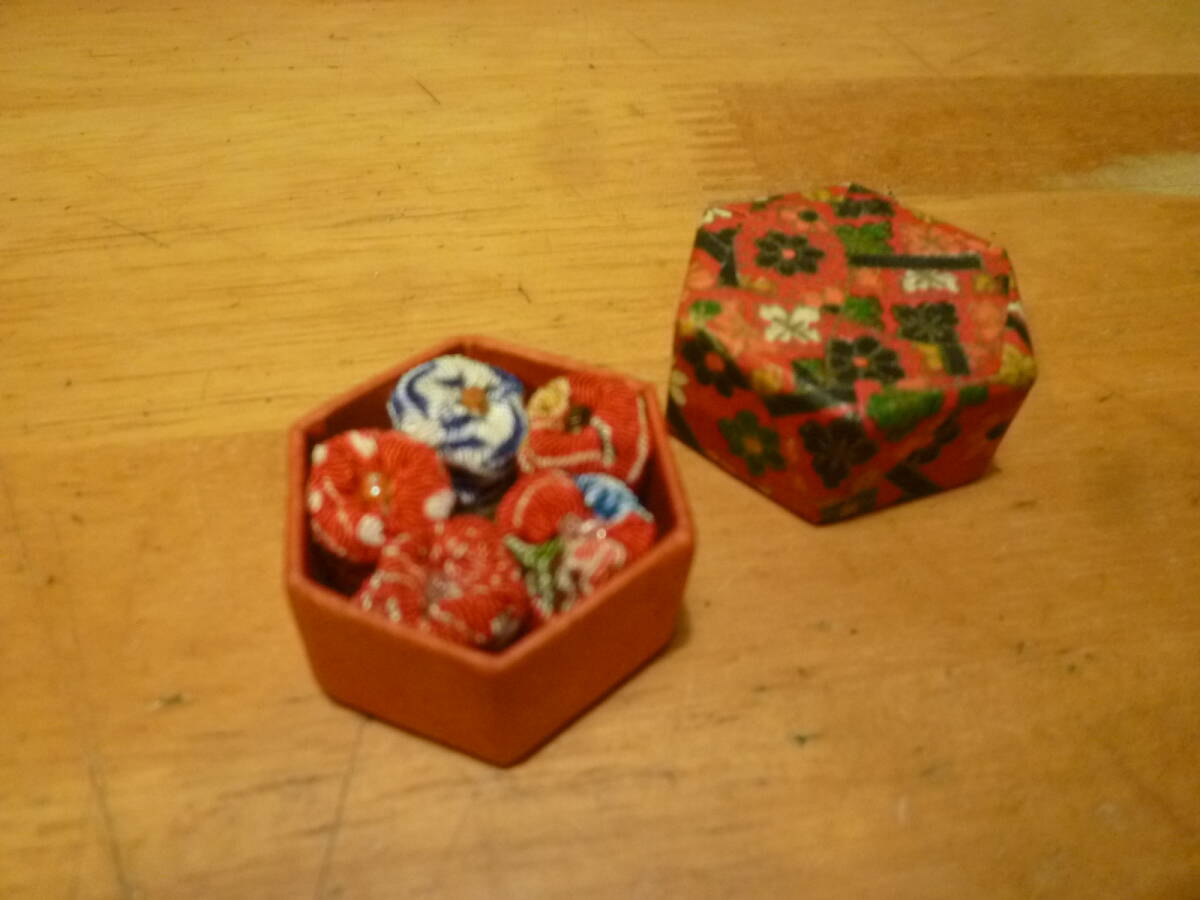 サイズ  お手玉の直径 1cm 高さ 1・5cmくらい 箱の一辺 1・6cmくらいの六角形 深さ 1・5cmくらい