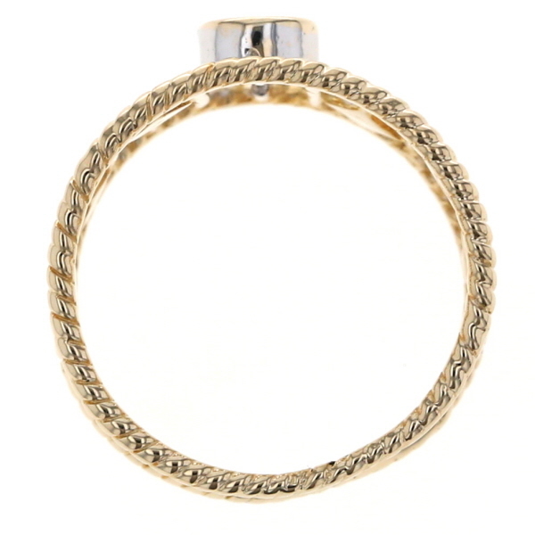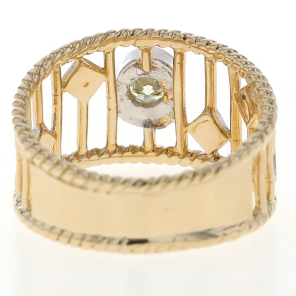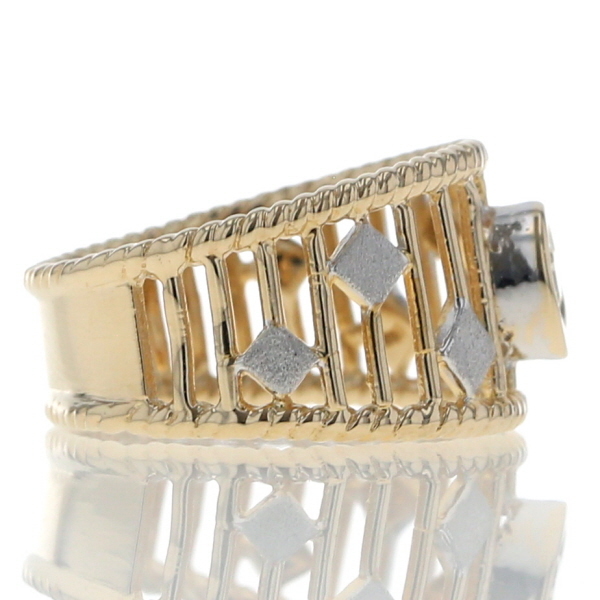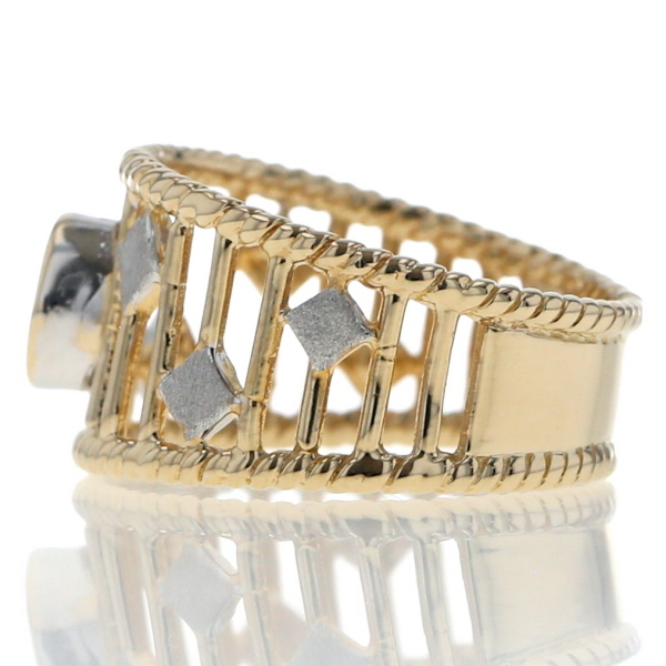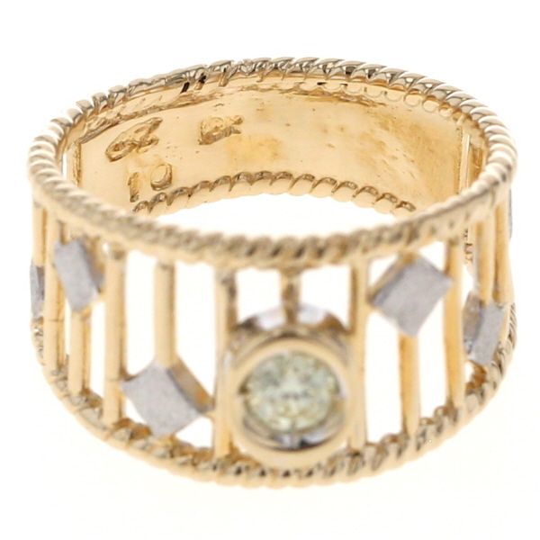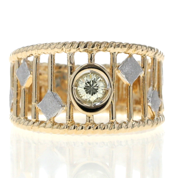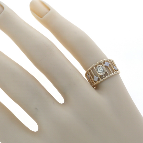 | 商品紹介 | 透かし模様にホワイトゴールドのアクセントを散りばめた、個性際立つK18コンビゴールドのリングです。 中央には一粒のダイヤモンドが輝き、繊細なイエローゴールドの透かしラインが指を包み込むようにデザインされています。 ところどころに配置された菱形のホワイトゴールドが、上品なリズムを添え、見る角度によって異なる表情を楽しめます。 クラシカルでありながらモダンな印象を放つ仕上がりで、他にはない存在感です。 |