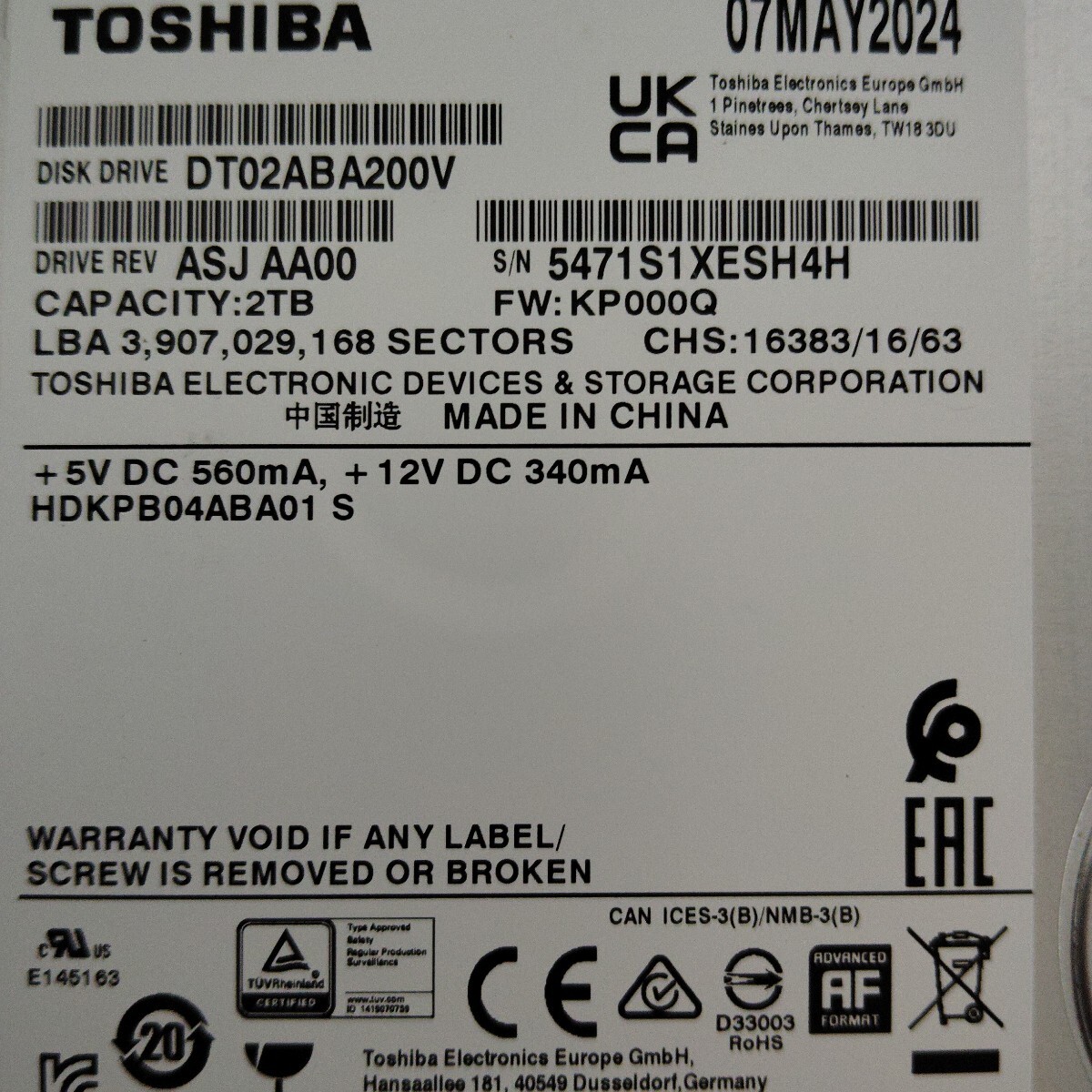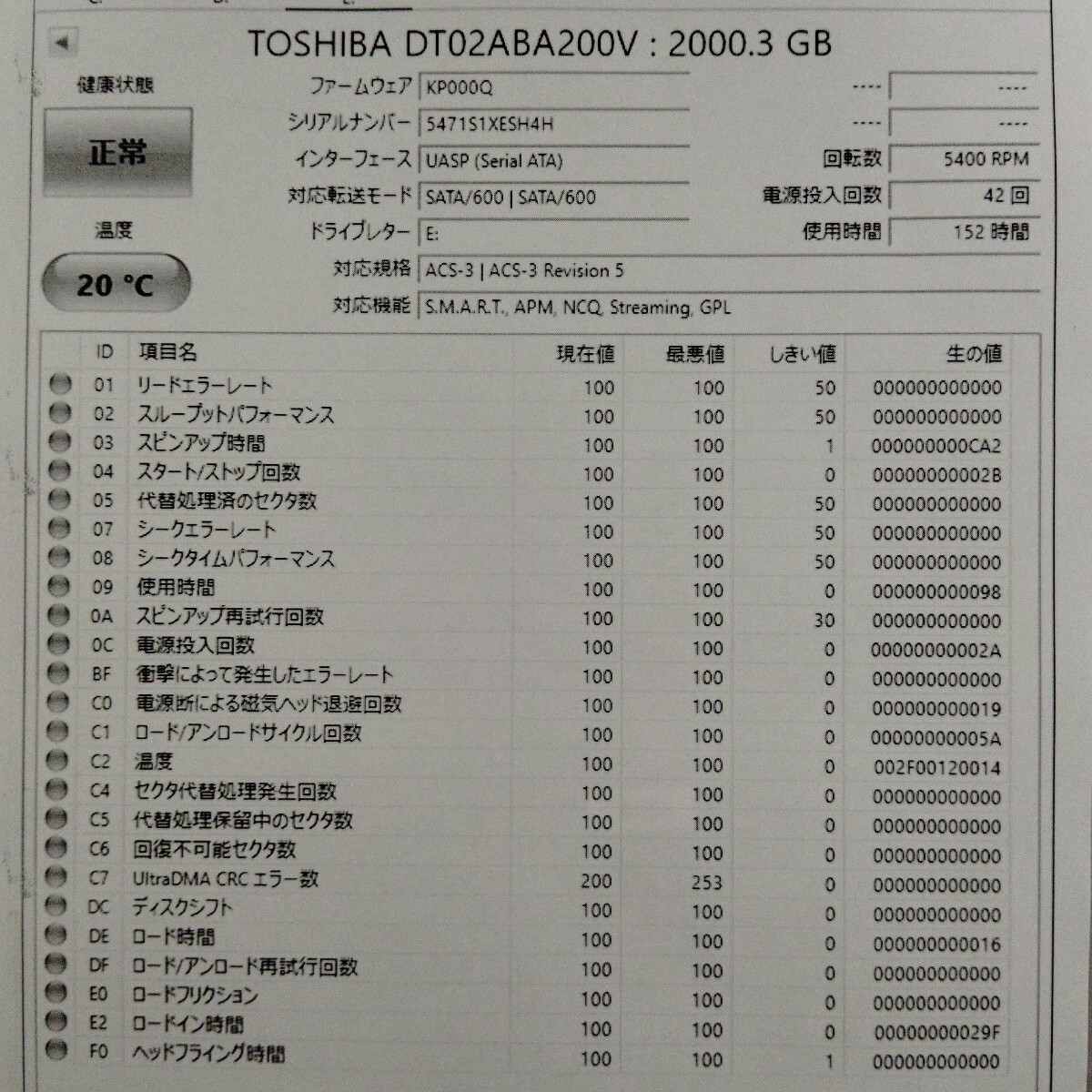 HDD 2TB 使用時間152/H TOSHIBA DT02ABA200V ハードディスク 正常 #063