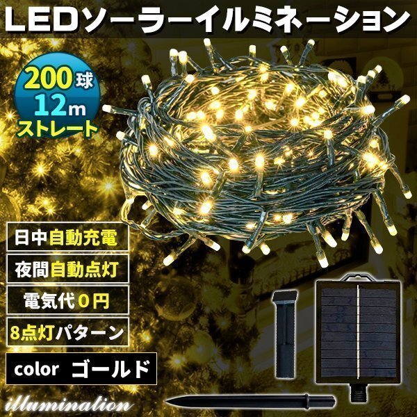 ソーラー イルミネーション 屋外 クリスマス ストレート 屋外用 イルミネーションライト 200球 ゴールド