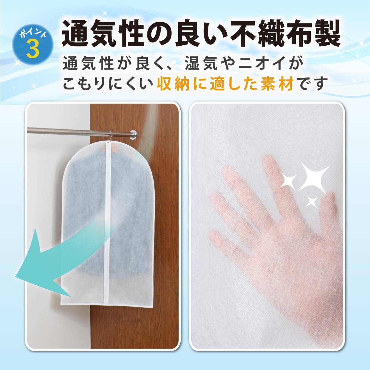 説明 商品名:スーツカバー ホワイト 3枚組 サイズ:約幅55×長さ100cm カラー:ホワイト 内容:3枚組 材質:ポリプロピレン 【特長】 ●オフシーズンの大切な衣類を1枚ずつしっかり守れるカバー。クローゼット内もスッキリ。 ●大切な衣類をホコリなどの汚れからガード。底閉じタイプなので下から舞い上がるホコリやダニもしっかりシャットアウト。 ●通気性が良く湿気やにおいがこもりにくい収納に適した素材である、不織布製の洋服カバー。 ●大きく開いて出し入れしやすいセンターファスナー仕様。ハンガーに掛けたまま出し入れができます。 【不織布とは】 不織布(ふしょくふ)とは、繊維を糸にして織ったり編んだりせずに、そのままシート状にした「織らない布状のもの」です。 通気性が良くホコリを通しにくい生地のため、衣類や寝具の収納に適しています。 アストロでは主にスパンボンド方式で製造されたポリプロピレン製の不織布を使用しています。 ASTRO CO. LTD established in 1970