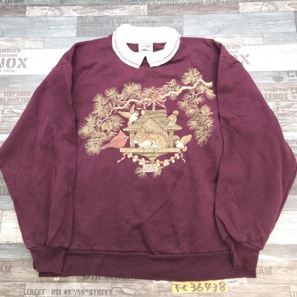 WHIM JERZEES ジャージーズ レディース USA製 裏起毛 松とアニマルプリント 襟付き トレーナー L エンジ です。