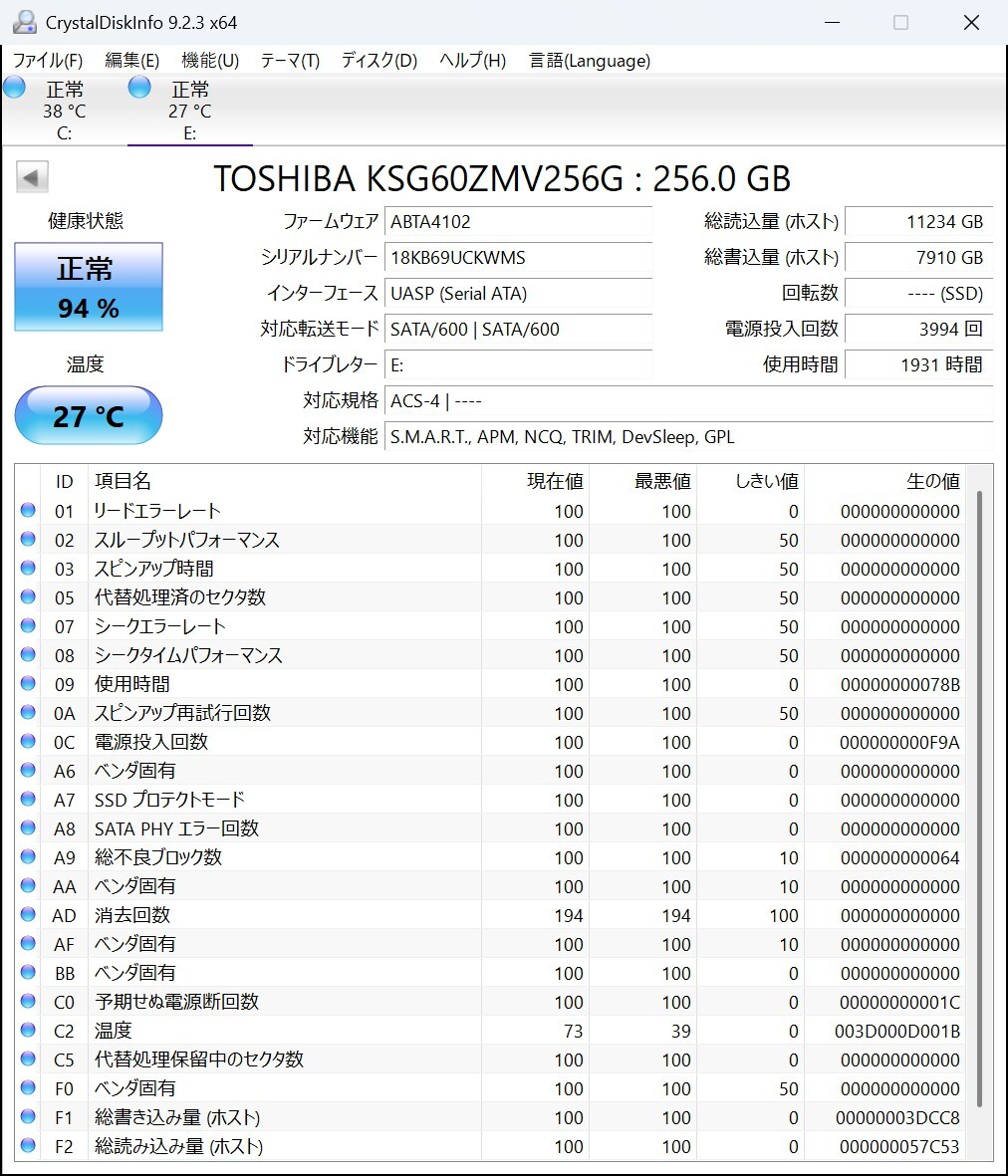 | ★☆1円 ~スタート☆Toshiba SATA SSD M.2 2280 256GB 使用時間:1931H☆★ | |
