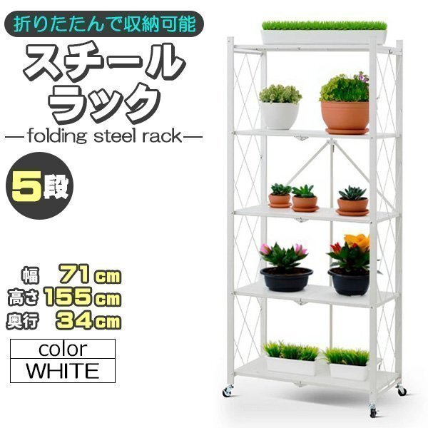 収納ラック 棚 金属シェルフ スチールラック メタルラック 折りたたみ 折り畳み スチール棚 キャスター付 組立簡単 頑丈 ホワイト 白 5段