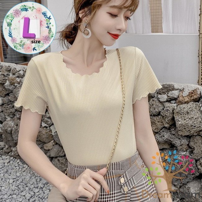 1スタ☆Solid color ラウンドフリル Tシャツ Lサイズ 美ライン 半袖 レディース オフィス カジュアル 無地 綺麗め K-088-8ベージュ