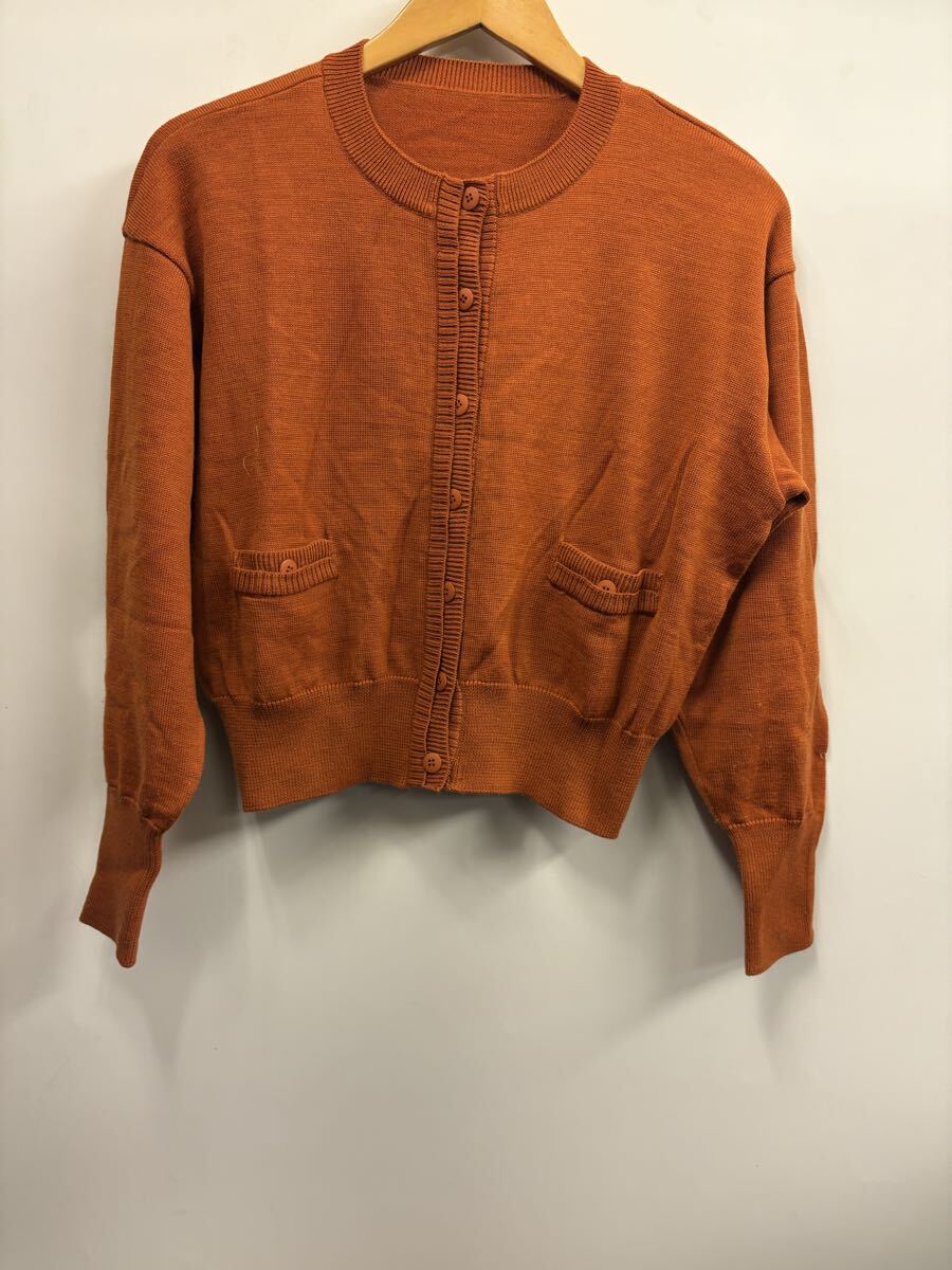 あたたかみのあるオレンジ〜テラコッタ系カラーのニットカーディガン。