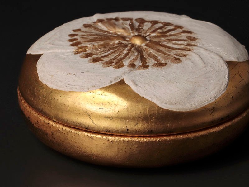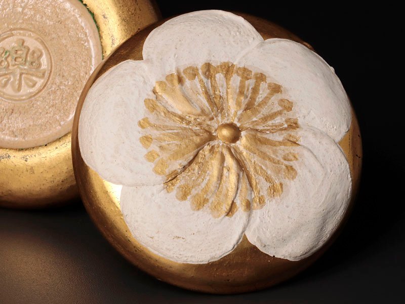 存在感を放つ梅と金溜の美しい輝きが目を引く香合です。 ★商品は十二代楽吉左衛門(弘入)造、惺斎書付の作品である事を保証致します。 |