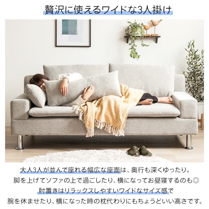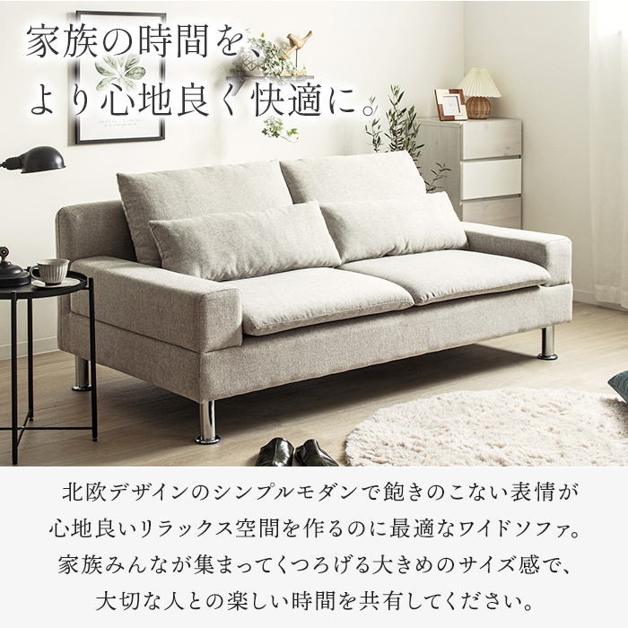 北欧デザインのシンプルモダンで飽きのこない、ワイドサイズの3人掛けソファー。