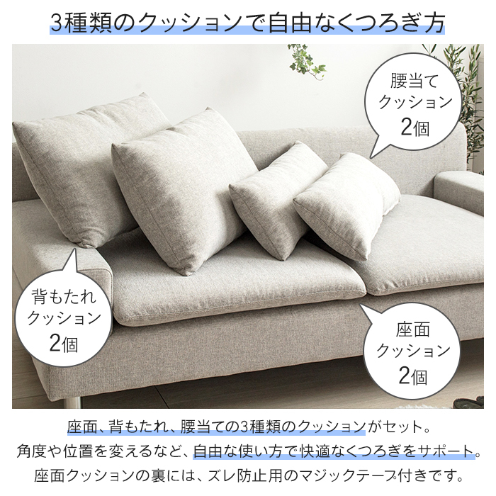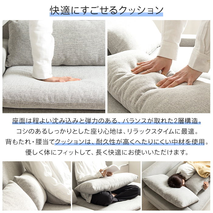 座面・背もたれ・腰当てと3種類のクッションがセット。自由な使い方で快適なくつろぎ時間をサポートします。