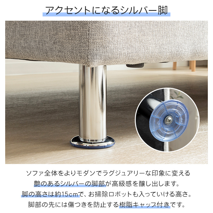 脚部はツヤのあるシルバーが高級感を演出。脚裏にはフローリングへの傷を防止する樹脂キャップが付いています。