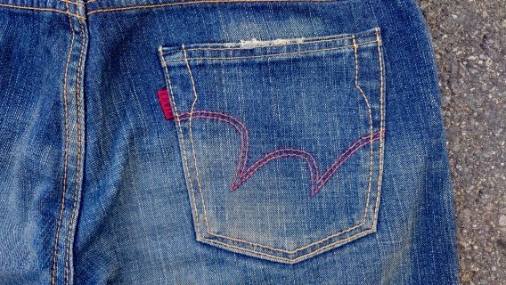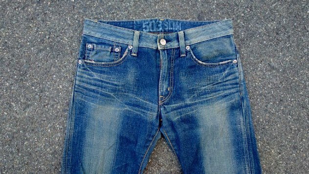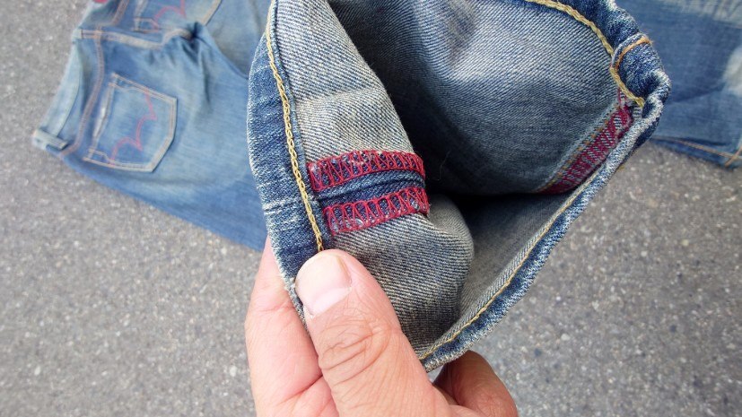スソ先・・・・・スソ先カット無しヴィンテージイエロー色糸チェーンステッチ。