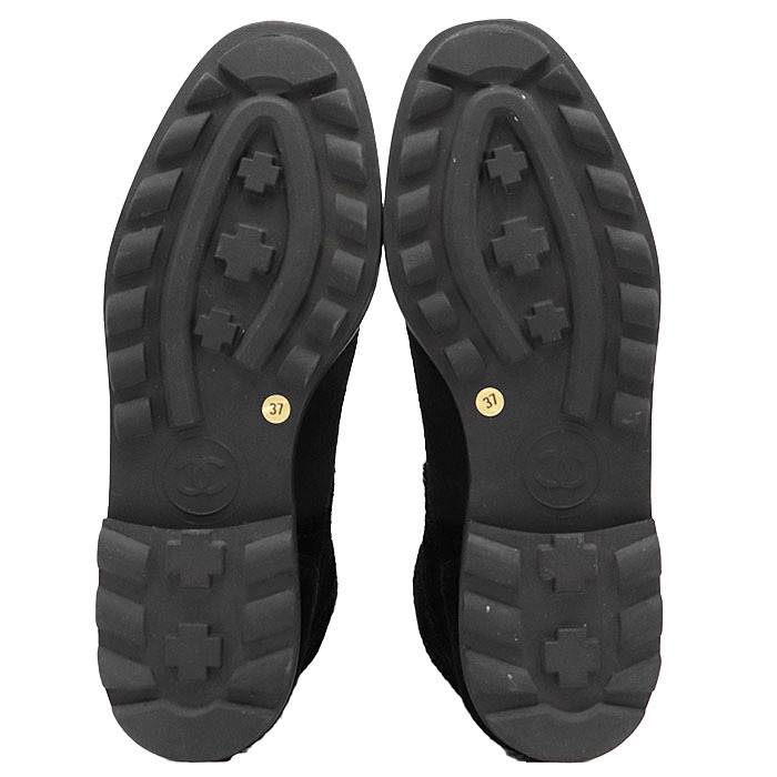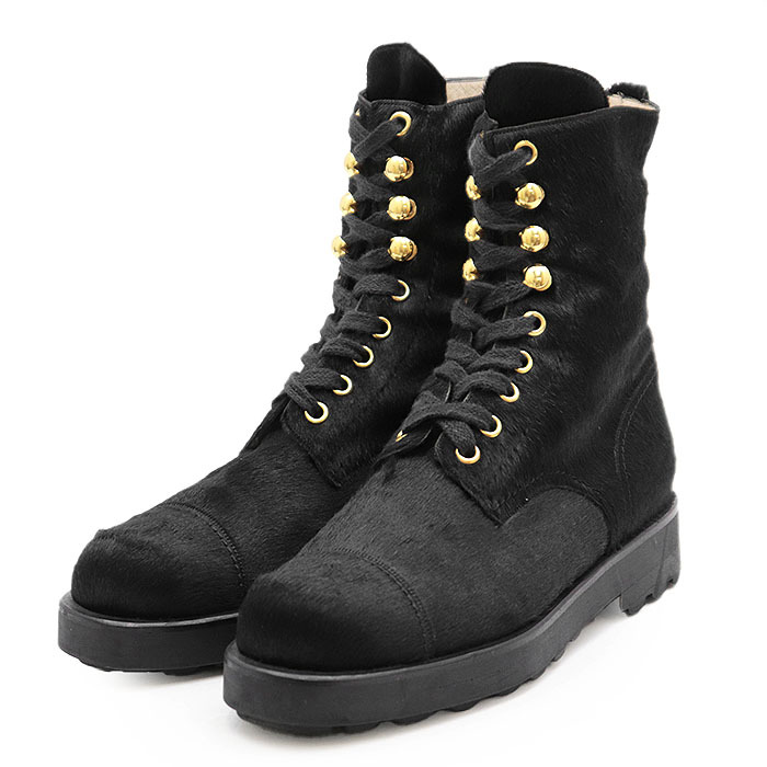 【美品】CHANEL シャネル アンクルブーツ ハラコ COCOマーク レースアップ ゴールドアイレット シューズ レディース 37 黒 フランス製