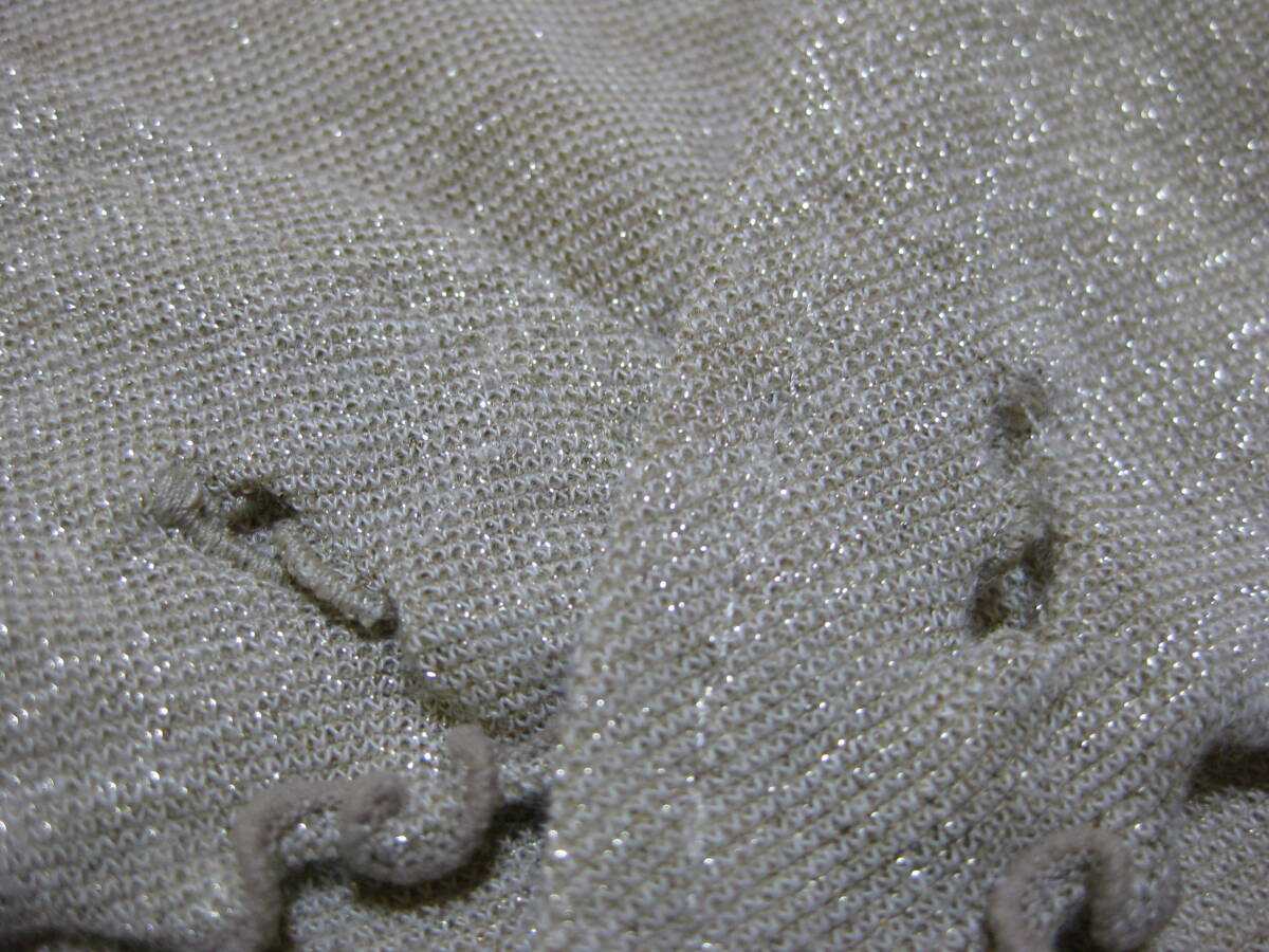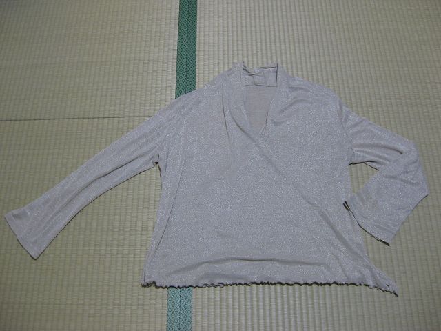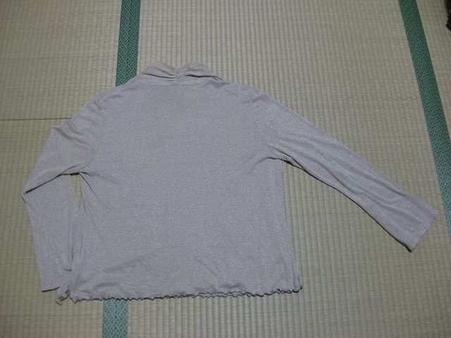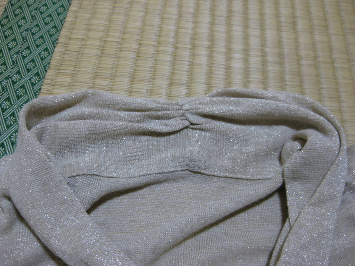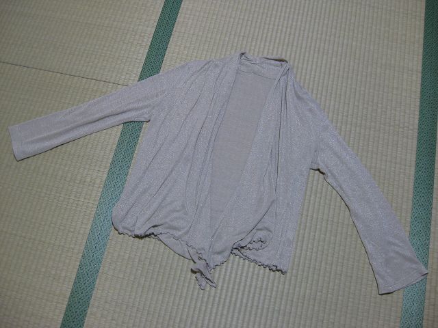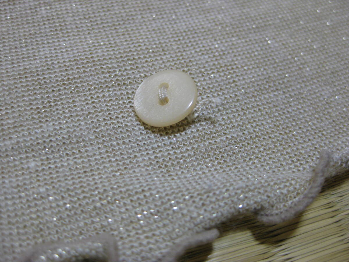 首の後ろ部分、キャザー造りの襟で、前ボタンはなく、羽織る、巻きカーディガンです。左右の裾の部分にボタン穴があり、両側肩の部分、両側裾の部分にボタンに留めて巻きカーディガンになります。左側の上下共ボタンが取れてしまい無い状態のまま着用。