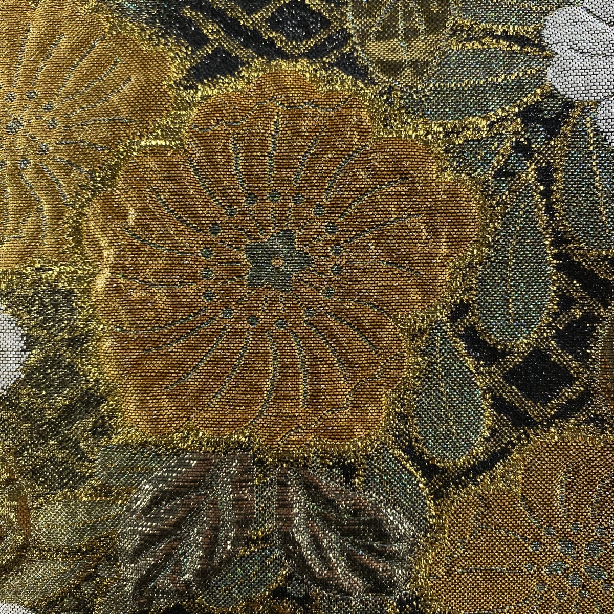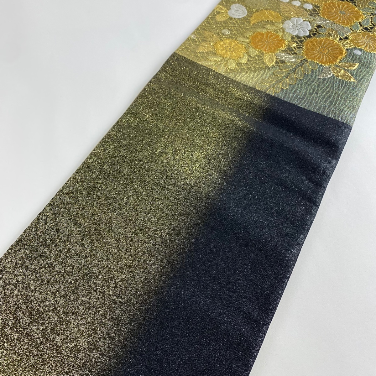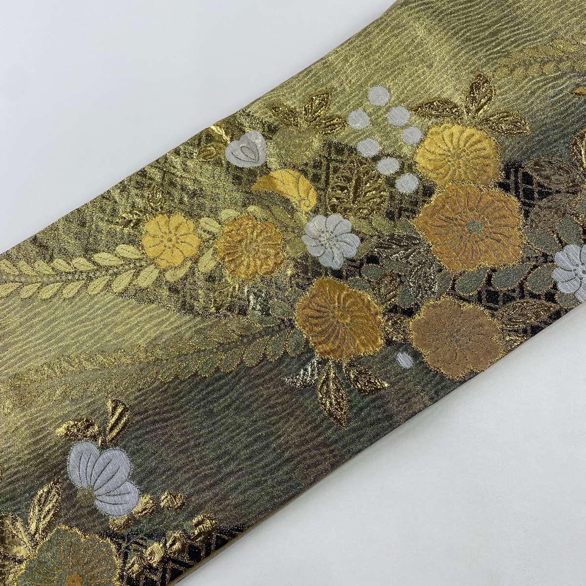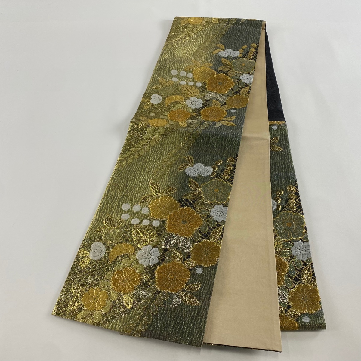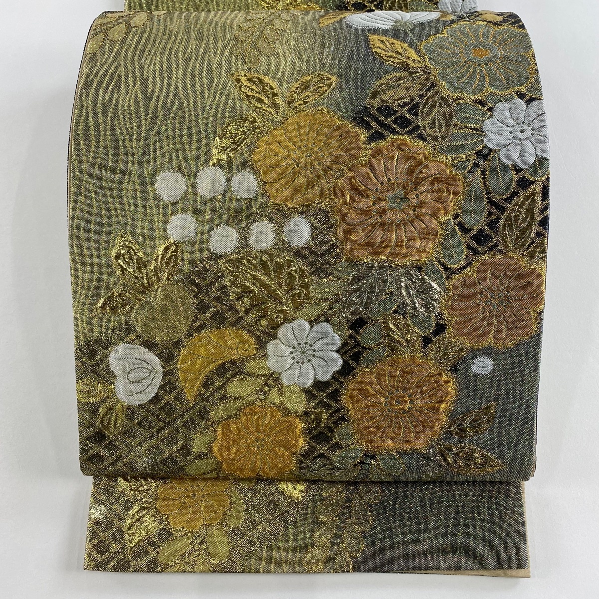 | 袋帯 美品 秀品 草花 箔 金糸 灰緑 六通 正絹 【中古】 |