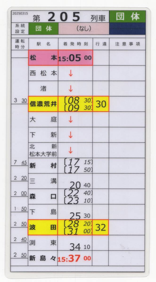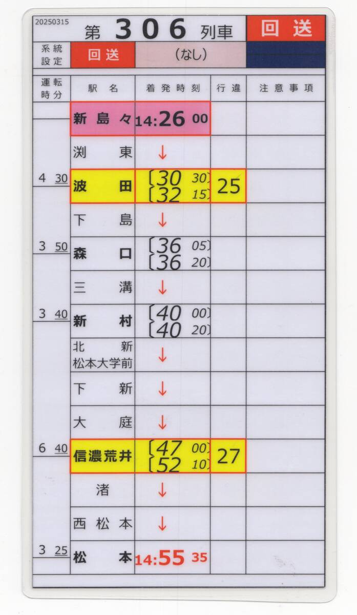 【アルピコ交通】上高地線運転士仕業表・第306列車/第205列車 団体仕業