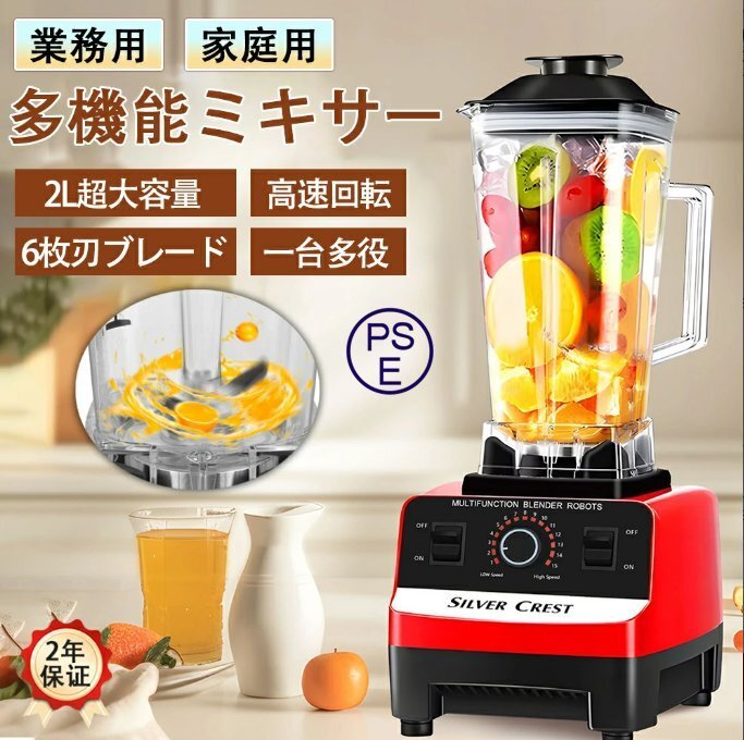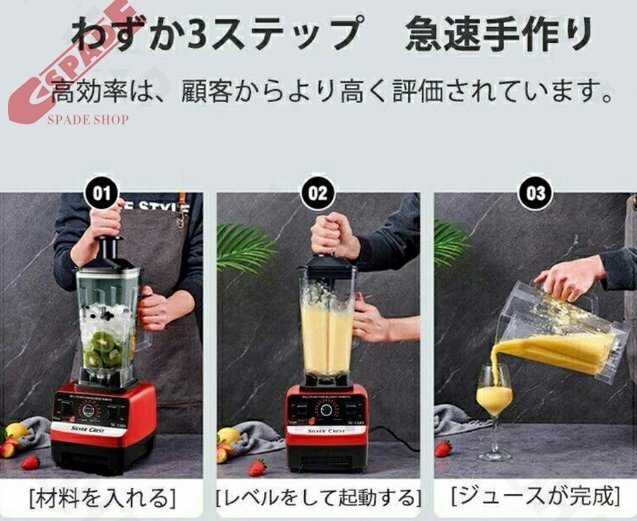 | 商品名:ミキサー/ジューサー 型号:SC-1589 容量:2000ml 電圧:100V-120V パワー:1800W 回転速度:29000r/min 高速回転 定格周波数:50HZ/60HZ カップの耐熱温度:-40~120℃ 対象人数:3~5人 サイズ:W190xD220xH440mm(コンテナセット時) 重量:4.2kg 保護装置 電流過負荷保護、モータ過熱保護。 素材:本体:ABS樹脂 / コンテナ:コポリエステル樹脂 / ブレード:ステンレス 2L ブレンダー 業務用ミキサー 家庭用 1800W ハイパワーブレンダー 1800Wのハイパワーで回転数も高く、数十秒でなめらかに仕上がります。軽くて丈夫なトライタン素材のジャーなので、扱うときの負担も軽減してくれました。 今までは苦手とされてきた固い氷を砕くことのできる強力なパワーを備えたものや様々な機能が追加されたタイプであり、 普段摂りづらい果物・野菜の不溶性食物繊維も含めて、繊維質をたっぷり摂取できます。 また腹持ちのいいジュースが作れるので、ダイエット中の方や腸内環境を改善したい方におすすめです。 安全性が高い ベースに滑り止めマットと振動軽減マットが付いていますので機械が安定していて、横転落の発生を有効に防止できます |