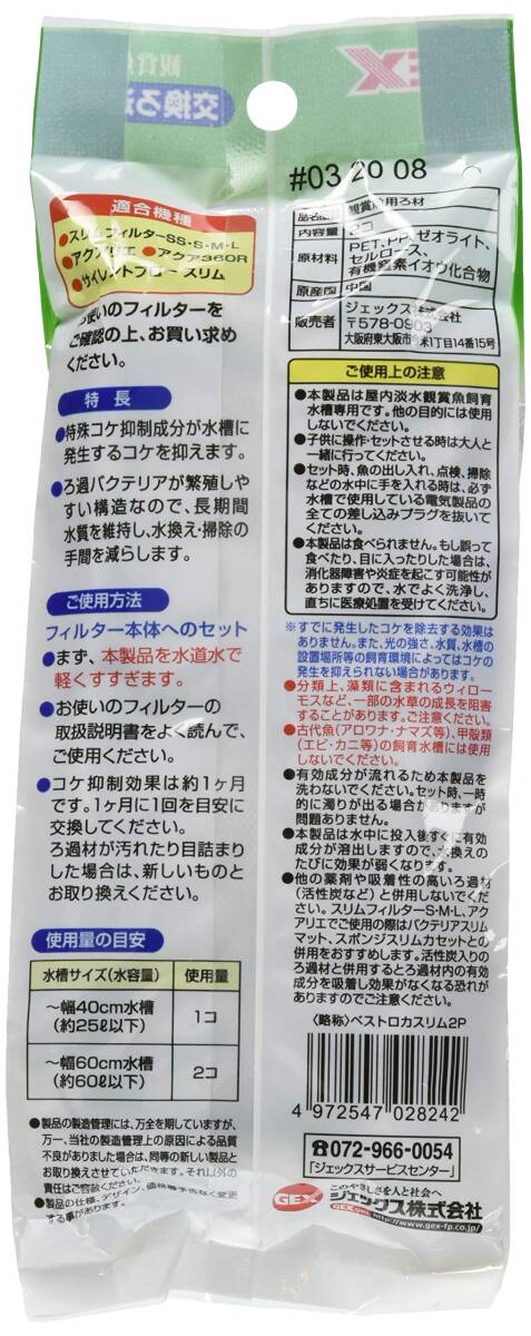 商品紹介商品名GEX ベストロカコケを抑えるスリムマット2個内容量2個サイズ5.5×1.4×13.5cm材質PET、PP、ゼオライト、セルロース、有機窒素イオウ化合物備考※パッケージデザイン等は予告なく変更されることがあります。※メーカー都合により商品のリニューアル・変更及び原産国の変更がある場合があります。製造国・原産国中国発売元・販売元ジェックスJANコード4972547028242使用上の注意※すでに発生したコケを除去する効果はありません。また、光の強さ、水質、水槽の設置場所等の飼育環境によってはコケの発生を抑えられない場合があります。※他の薬剤や吸着性の高いろ過材(活性炭など)と併用しないでください。活性炭入りのろ過材と併用するとろ過材内の有効成分を吸着し効果がなくなる恐れがありますのでご注意ください。原材料・成分PET、PP、ゼオライト、セルロース、有機窒素イオウ化合物使用方法本製品を水道水で軽くすすいでからご使用ください。使用量の目安:~幅40cm水槽(約25リットル以下)/1コ、~幅60cm水槽(約60リットル以下)/2コご注意(免責)>必ずお読みください●分類上、藻類に含まれるウィローモスなど、一部の水草の成長を阻害することがあります。ご注意ください。●古代魚(アロワナ・ナマズ等)、甲殻類(エビ・カニ等)の飼育水槽には使用しないでください。
