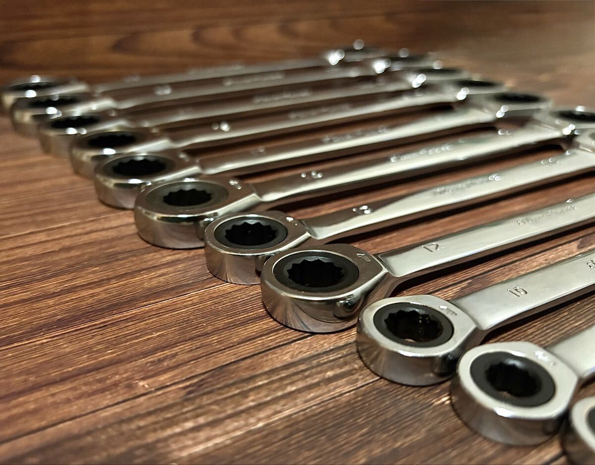 6mm〜24mmとギアレンチのセットとしては幅広いサイズで揃えておりますので、様々な作業でお使い頂けるかと思います。