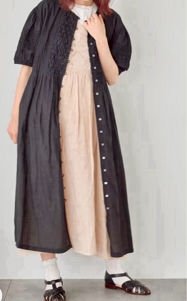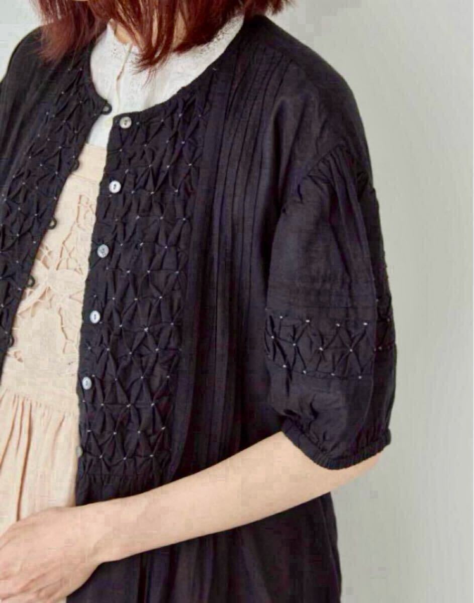胸元と袖口にはハンドスモッキングを入れて、留める糸を配色にしています。