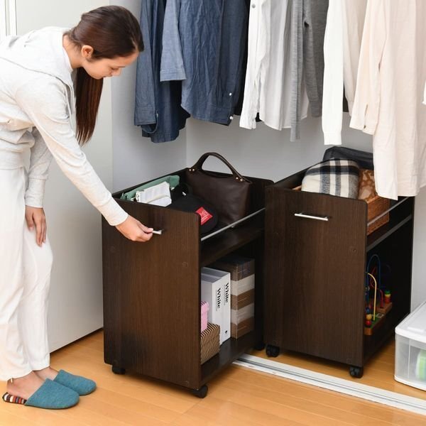 | キャスター付きの便利なクローゼットラック2個組。 取っ手はどちらにも取り付け可能なので、収納箇所の向きは左右入れ替えできます。 幅が広いので収納場所に困る大きな日用品のストックにも最適。 クローゼット内のスペースを有効活用するのでお部屋をすっきり片付けられます。 |