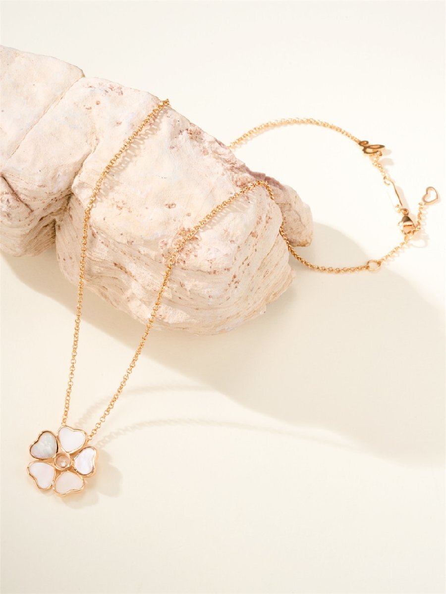 金属 18K ローズゴールド チェーンの長さ 45 CM 「ハッピーハート フラワーズ」は、メゾンのシンボルを取り入れ、ムービングダイヤモンドを中心に5つのハートで構成される花冠を配して、極めて女性らしい繊細な花のモチーフに仕上げています。 |