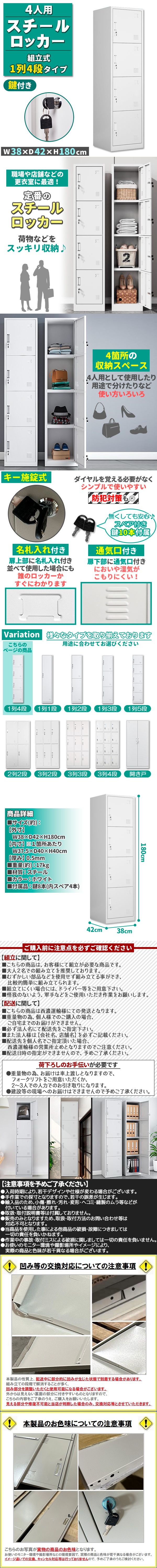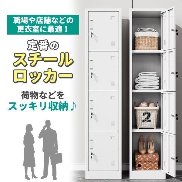 ロッカー スチールロッカー 4人用 ホワイト 白 鍵付き スペアキー付き 1列4段 スチール製 収納 オフィス 事務所 会社 店舗 学校 業務