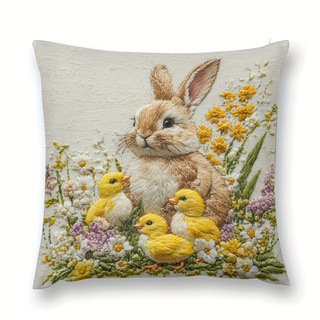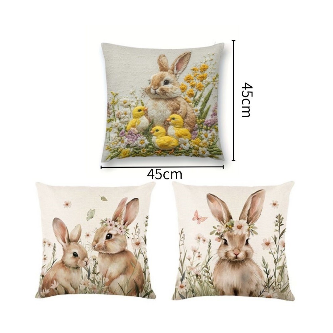 【クッションカバー3枚セット】上質なリネン生地上質な 45×45cm ウサギ&ヒヨコ柄 春の訪れ ナチュラル ◎