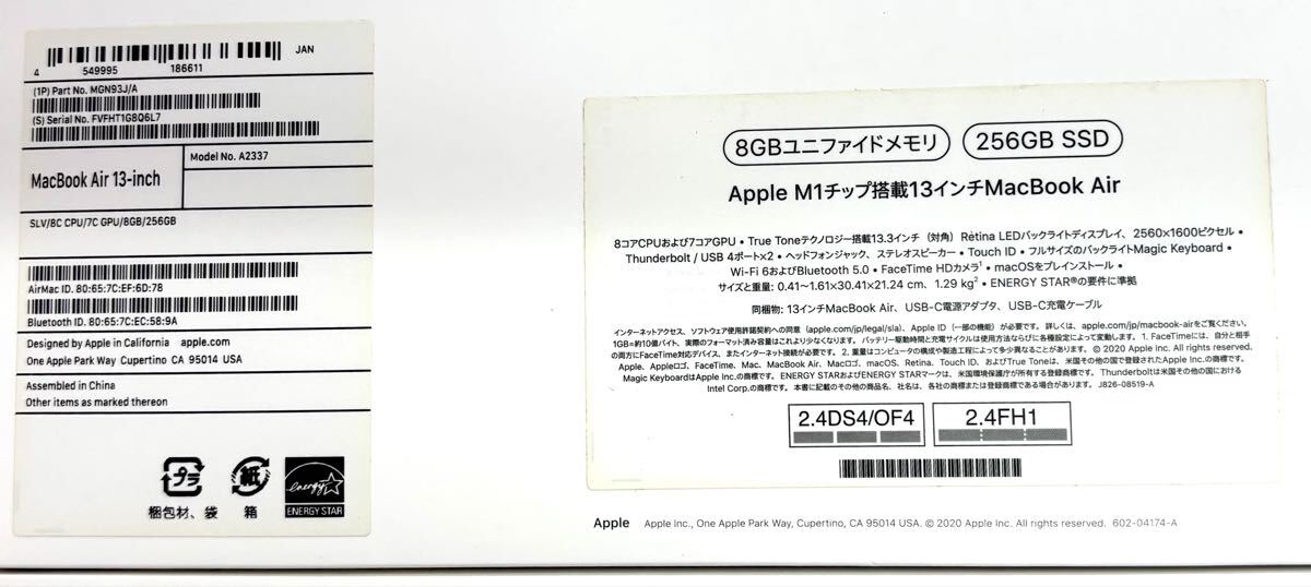 | 【中古品】Apple MacBook Air 13インチ Apple M1 8GB 256GB MGN93J/A シルバー 初期化済 | ||