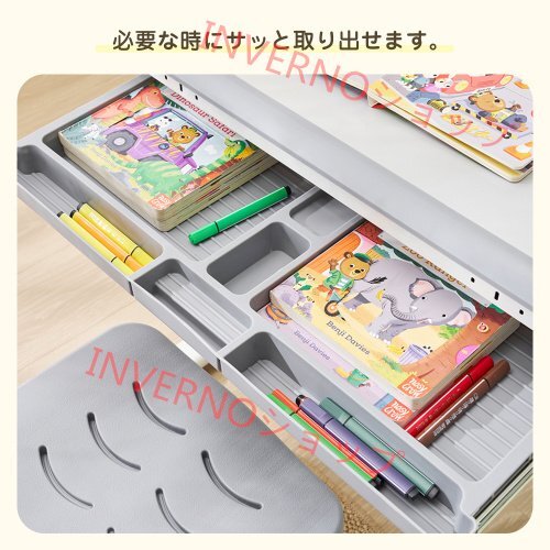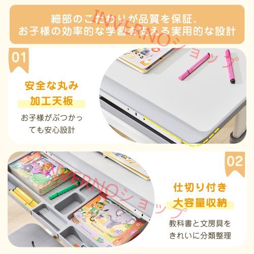 • ①安全な丸み加工天板お子様がぶつかっても安心設計②仕切り付き大容量収納教科書と文房具をきれいに分類整理③ペン落とし防止スロット鉛筆やマーカーが散らからない便利な収納④床保護キャップ付きフローリングを傷つけません