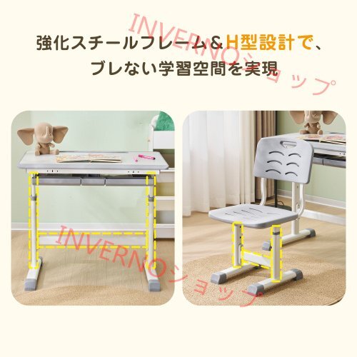 • 机は厚手天板でキズに強く300kg耐荷重、椅子は頑丈な設計で120kgまで対応。強化スチールフレーム&H型設計で、ブレない学習空間を実現