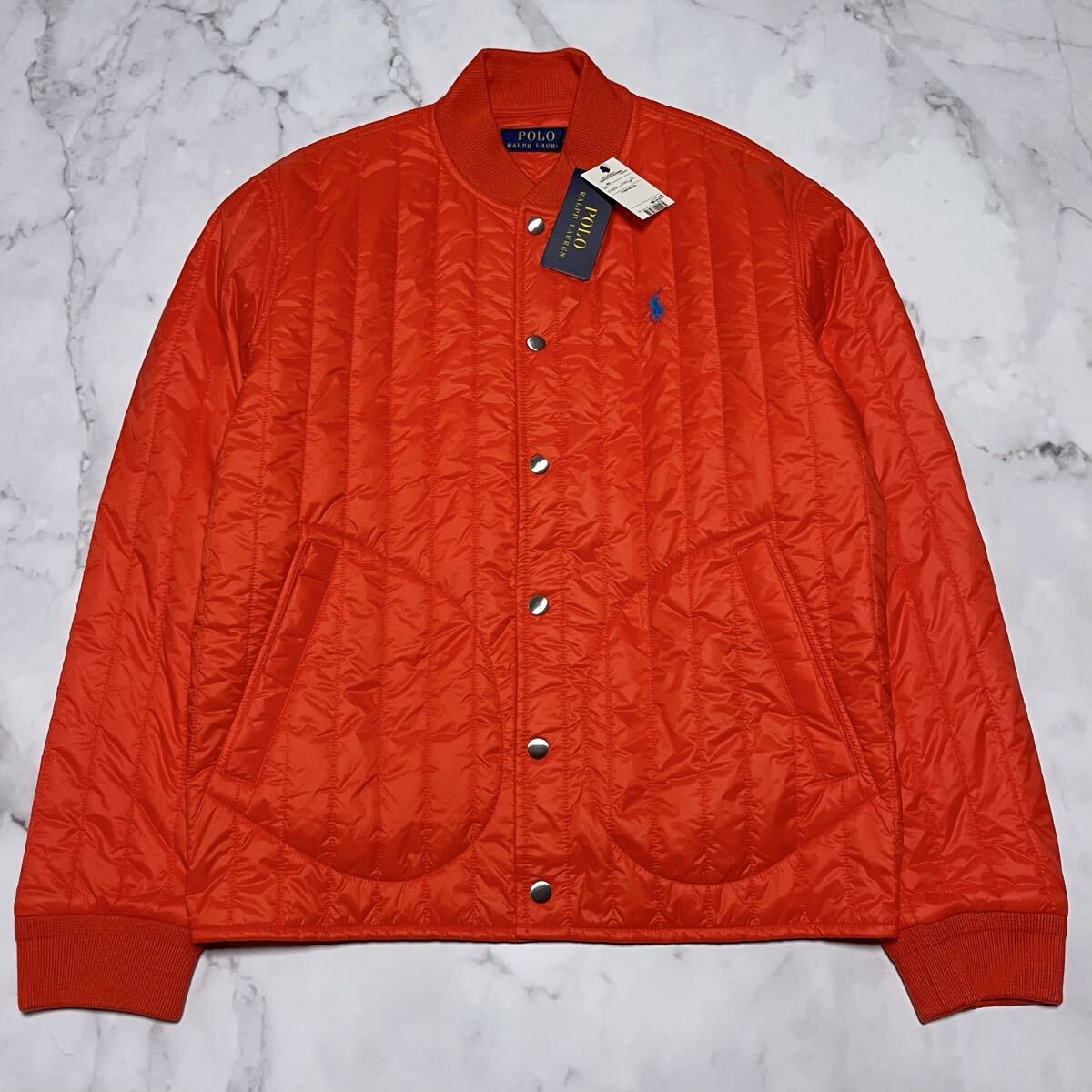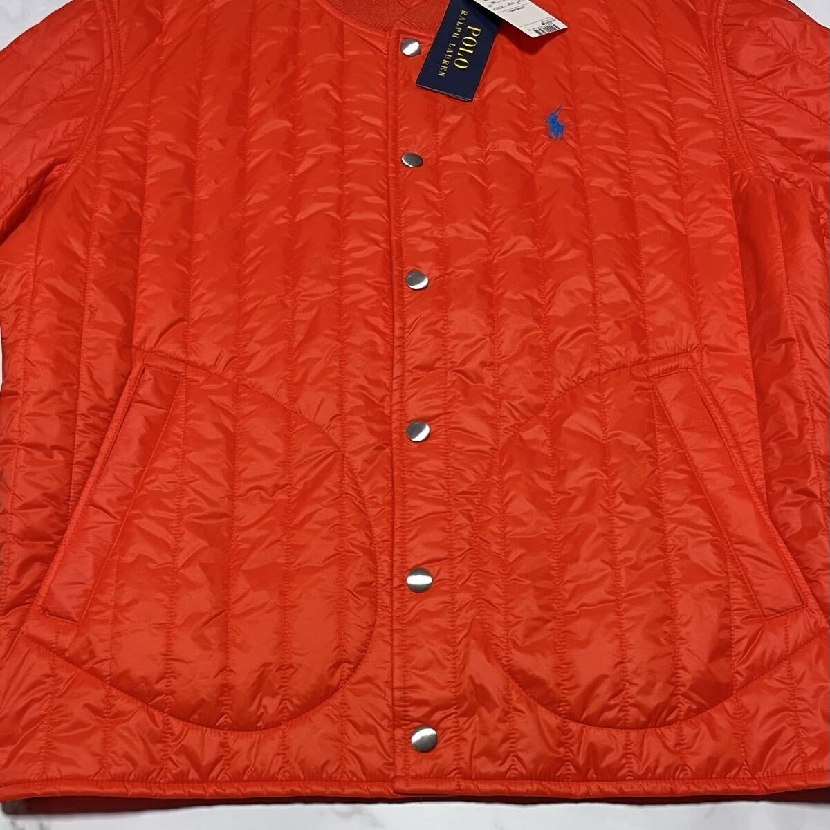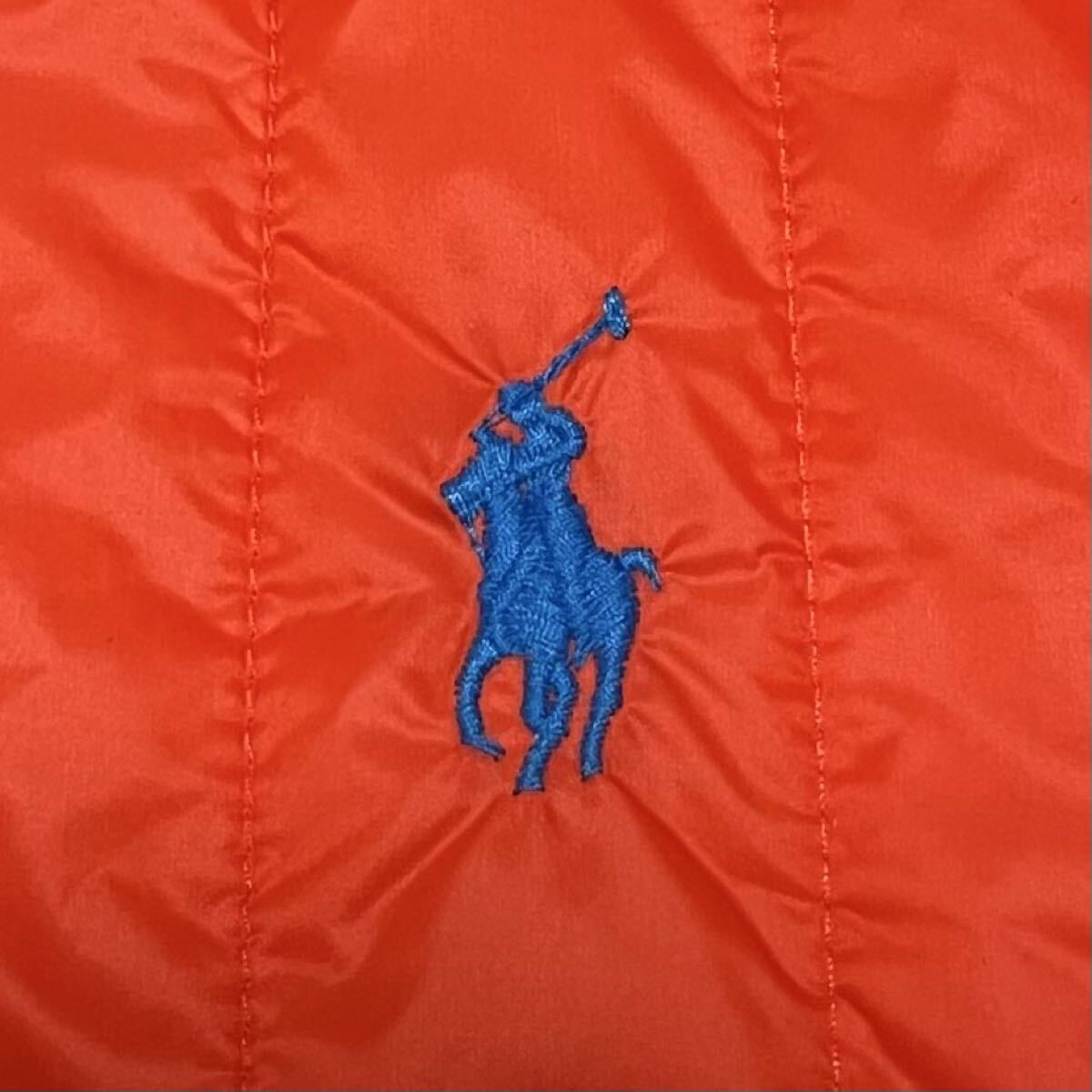 鮮やかなオレンジのナイロン生地に、左胸のブルーポニー刺繍が映える上品なデザイン。