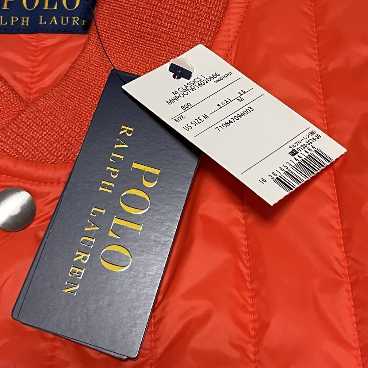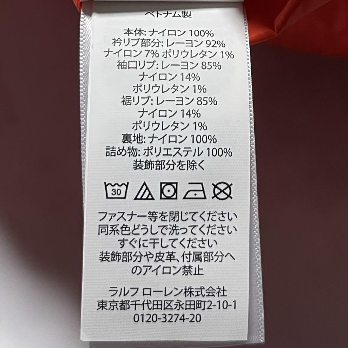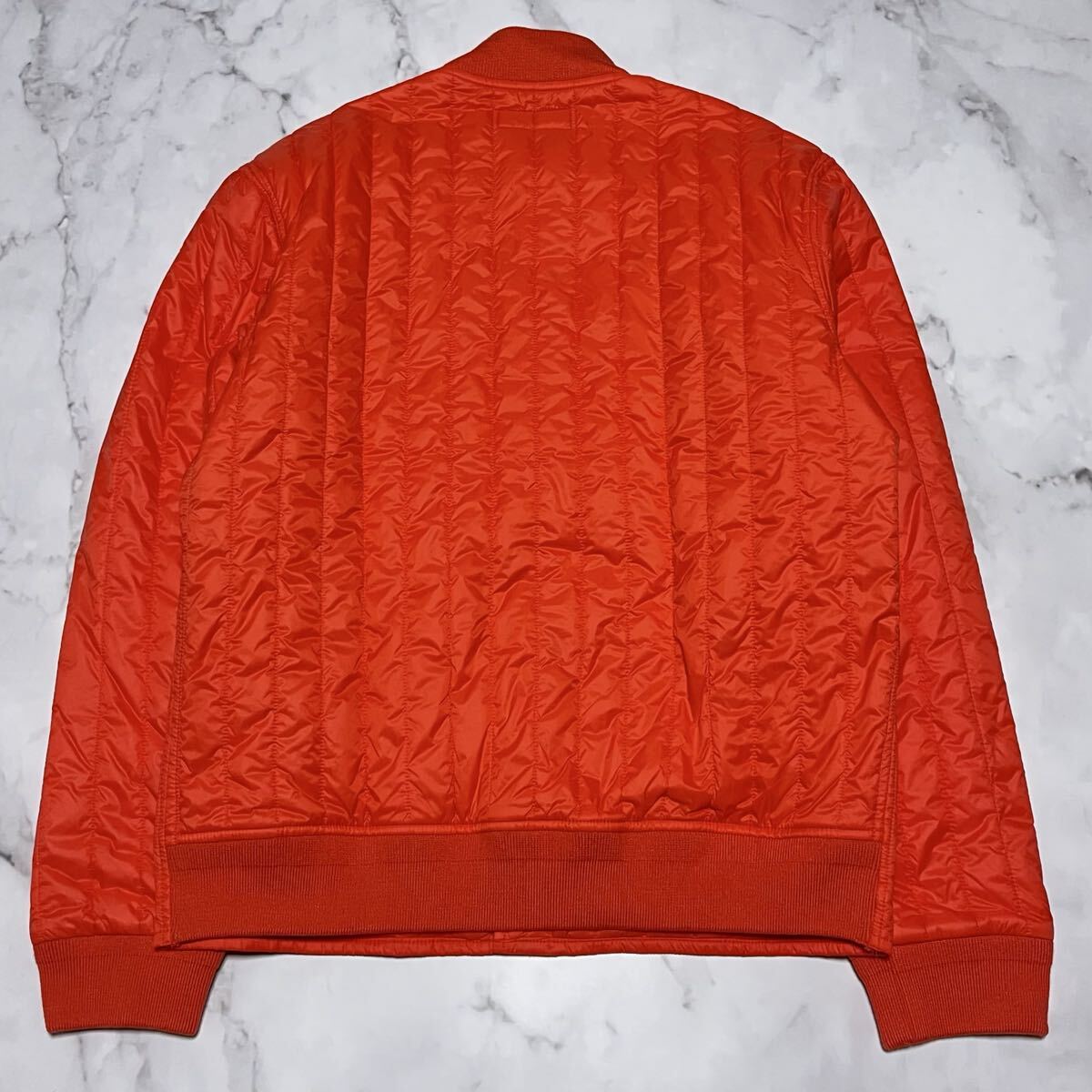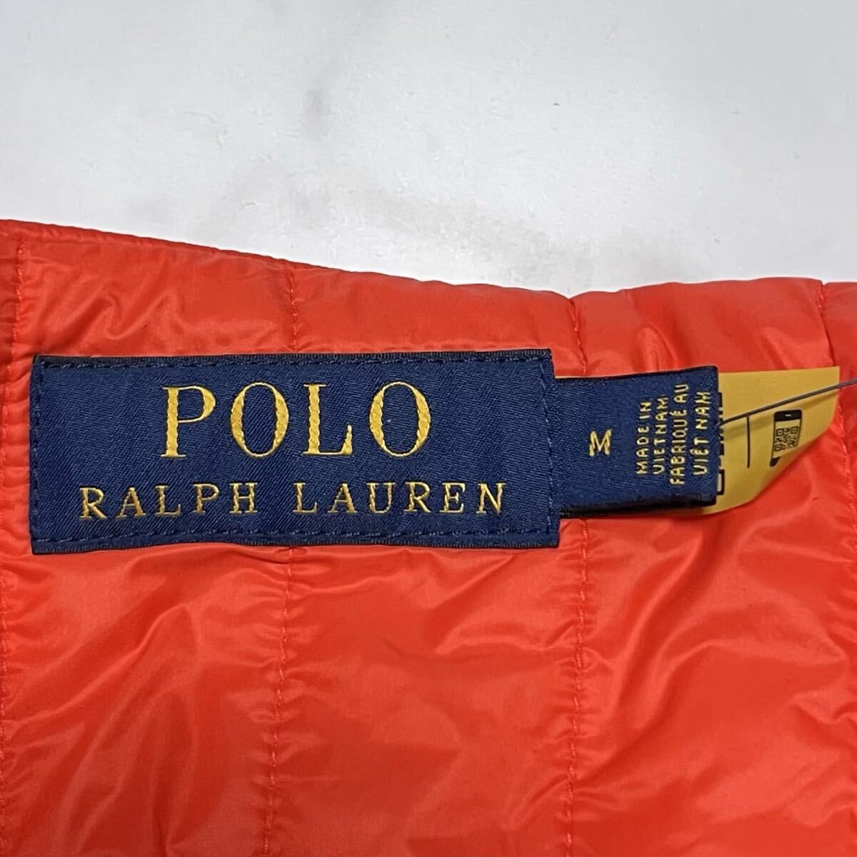 鮮やかなオレンジのナイロン生地に、左胸のブルーポニー刺繍が映える上品なデザイン。