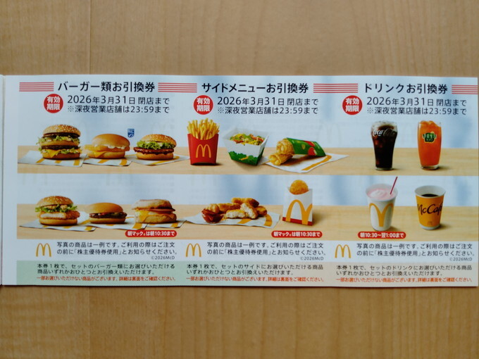 マクドナルド株主優待 1シートです。