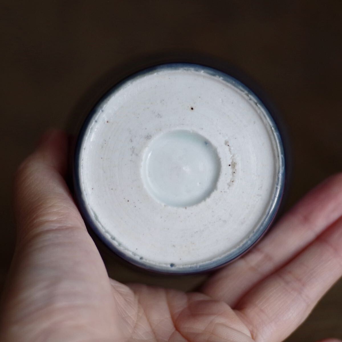 希少な総瑠璃の古伊万里蕎麦猪口でございます。時代は江戸後期頃と見ております。瑠璃釉の蕎麦猪口は人気のある品ですが、こちらは素地のわずかな凹凸や、口縁部に流れる釉薬の表情など、シンプルな作りの中にも景色があり、見飽きぬ味わいとなっております。