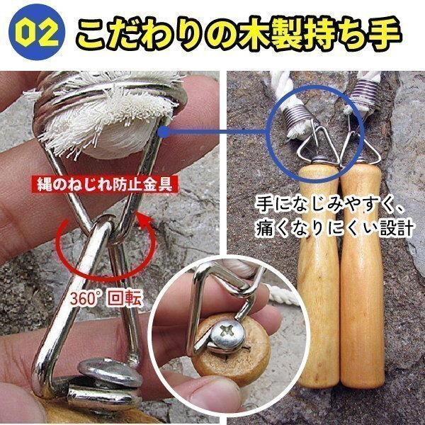 木製グリップと縄の接続部は360°回転する金具で留められているので縄のねじれを防ぐ造りとなっております。