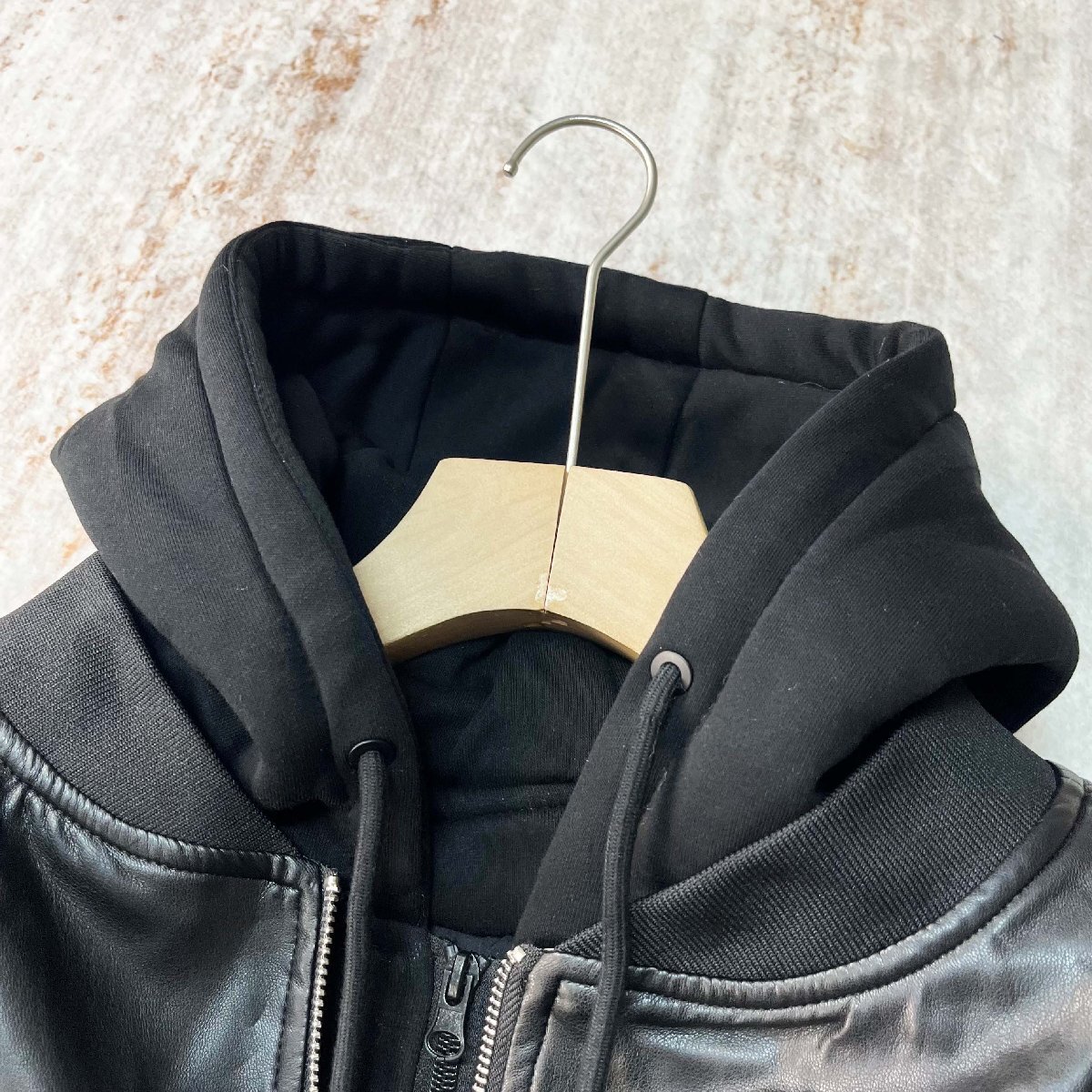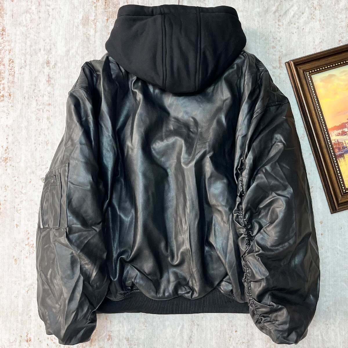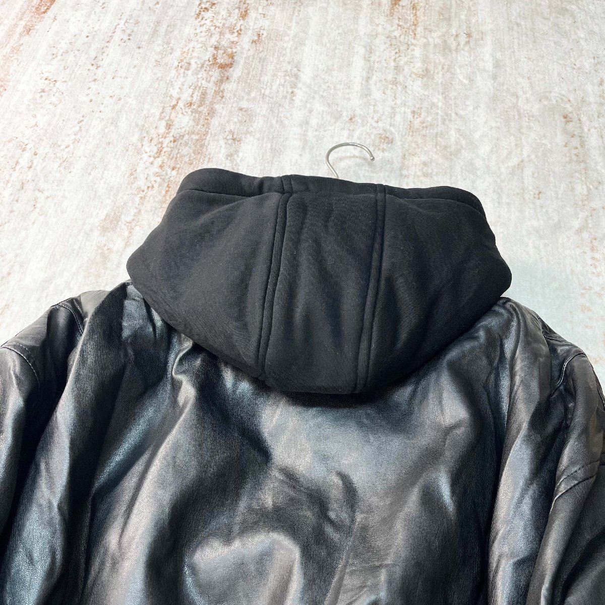 一枚限定 レザージャケット ロンドン製造 コットン混 中綿ジャケット 重ね着 フード付き カッコイイ アウター ライダース 革ジャン SIZE:L