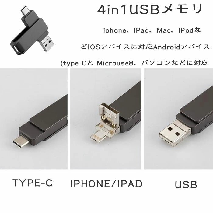 スマホには多くの写真、動画、ファイルなどが保存されると、容量不足なことはよくあり、USBメモリも不可欠になります。USB端子のみを備えた伝統的なUSBフラッシュドライブは、USBコネクタを備えたデバイスでのみ使用できます。機能は非常に単一です。こちらの四つの端子を備えた人気なUSBメモリは、多くのデバイスで使用できます。