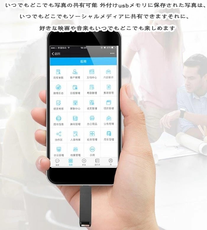 USBメモリにはUSB、IOS、Micro usb、TYPE Cの4種類のコネクタがあり、Phone、パソコン、Pad、Androidスマホなどのデバイスの間でデータ転送は簡単になります。(★ご注意:IOSデバイスを使う際に、専用アプリ「Y-Disk」をダウンロードしてください。Androidデバイスの場合に専用アプリ「Y-Disk」は必要ではなく、USBを挿入してすぐ使用できます。)