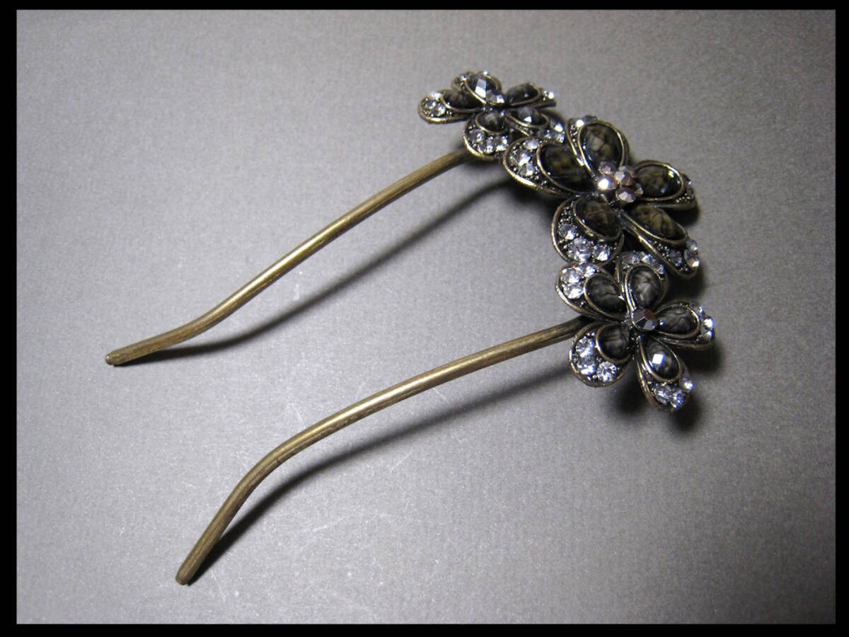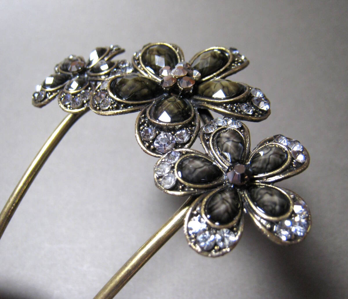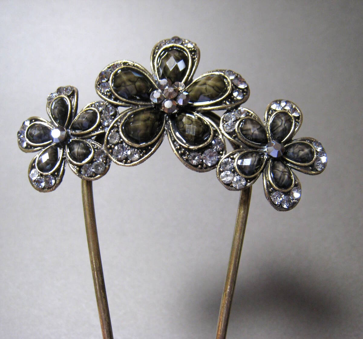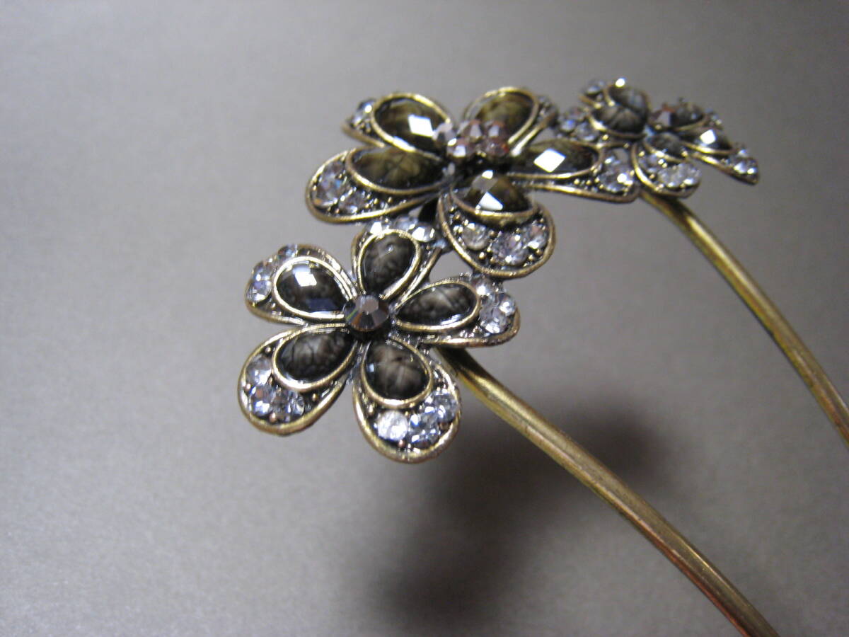 三つ花 彫金 グレー ガラスビーズ 簪 和洋装 髪飾り シック 花 かんざし