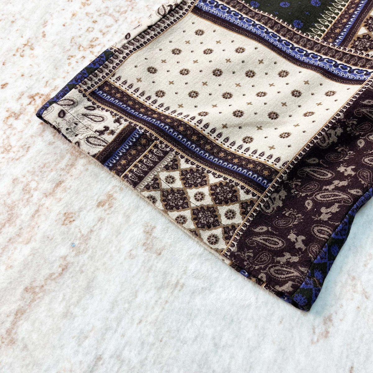 パッチワークデザインと民族風の柄が印象的で、個性を引き立てつつ、ヴィンテージ感のある雰囲気が魅力の一着です。ウエストには伸縮性のあるゴムと調整可能な紐を採用し、体型を選ばず自由に着用可能です。裾周りにゆとりをもたせたゆったりシルエットで、動きを妨げずに快適な着心地を提供します。さらに、サイドに2つ、後ろに1つのポケットがあり、スマホや鍵などの小物収納にも大変便利です。