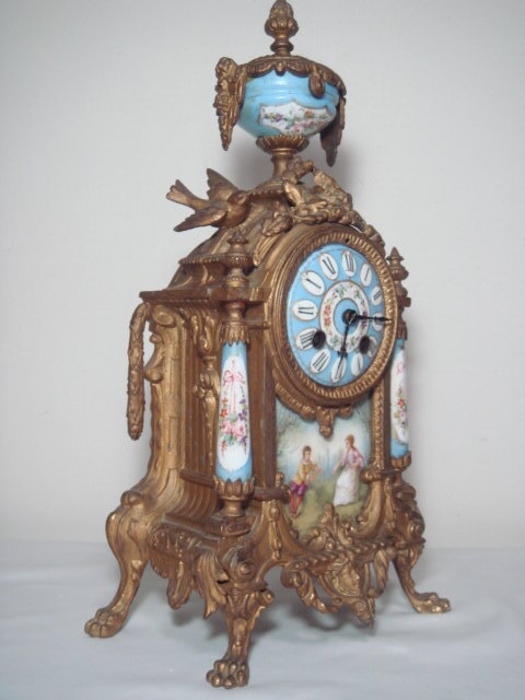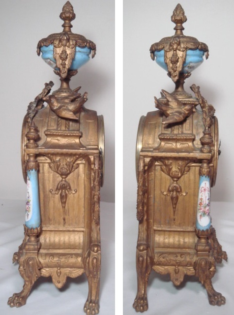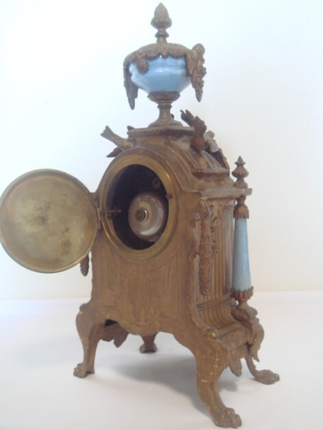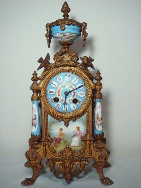 1800年代後期 フランス製の青セーヴル磁器 金メッキ マントルピース時計 8日巻き 機械式 置時計 可動品