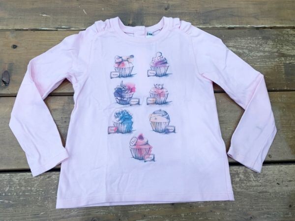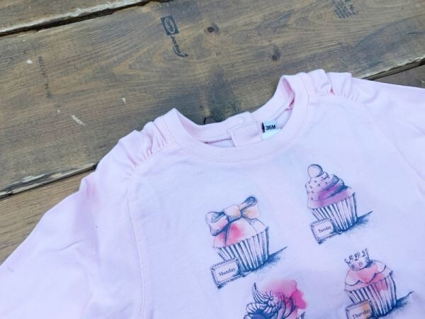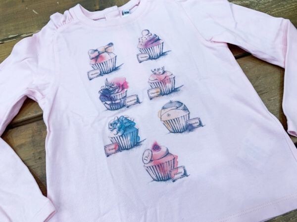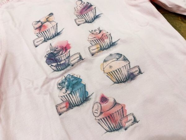 水彩カラーリングのカップケーキがプリントされた可愛らしい印象の一着となります。