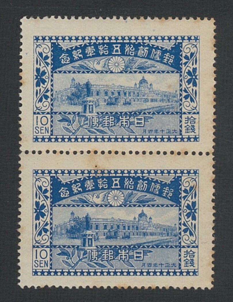 日本切手 1921年「郵便創始50年」10銭 縦ペア 未使用 シミ