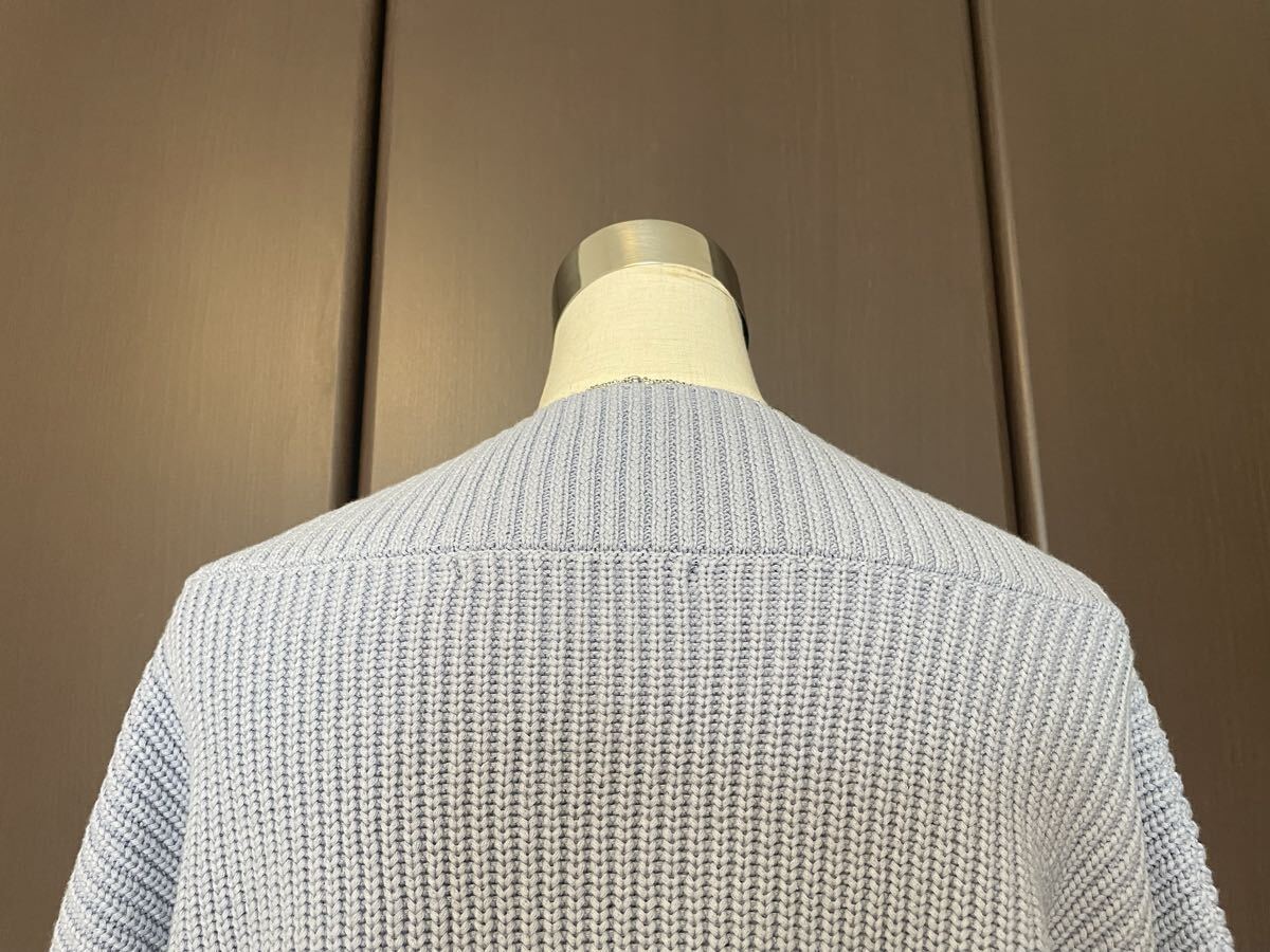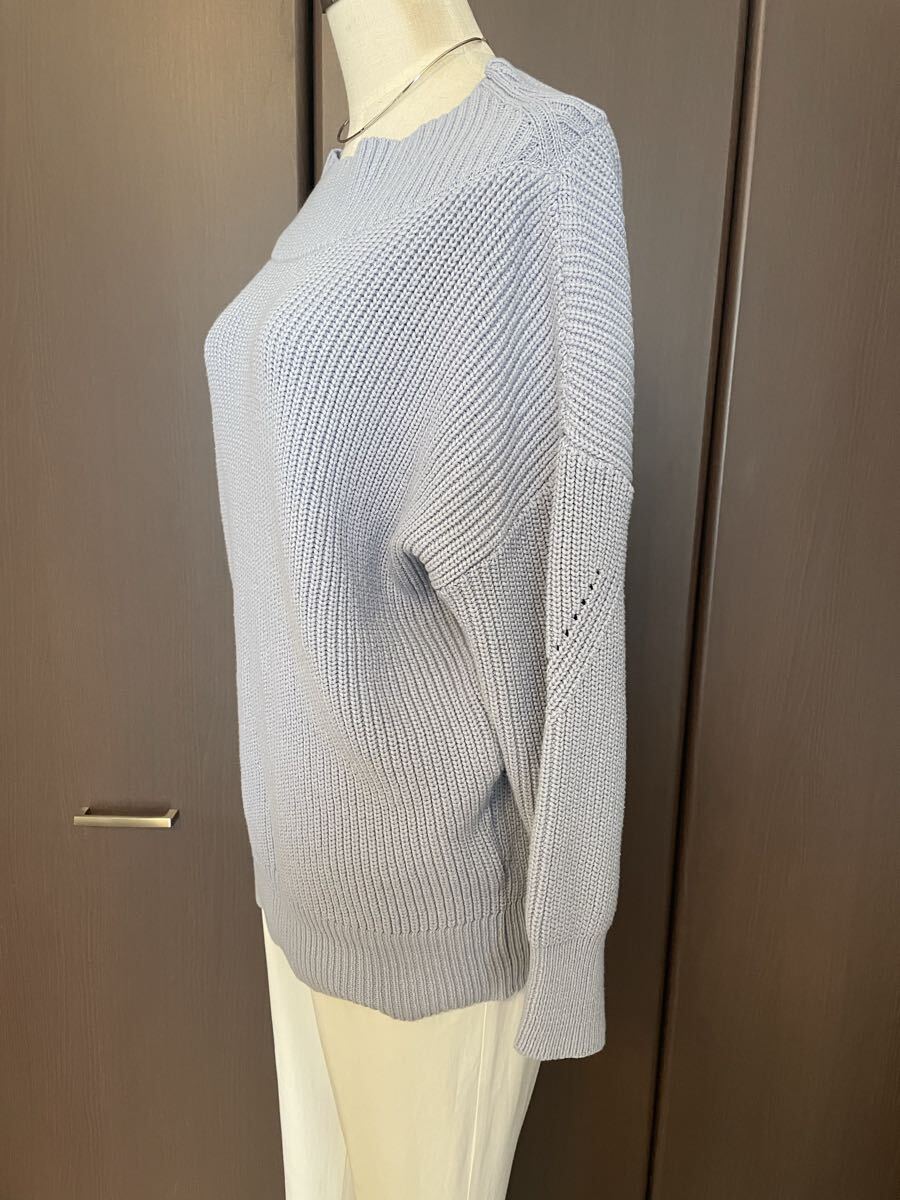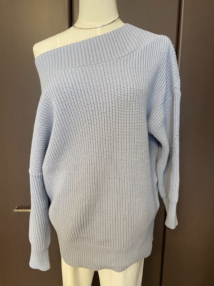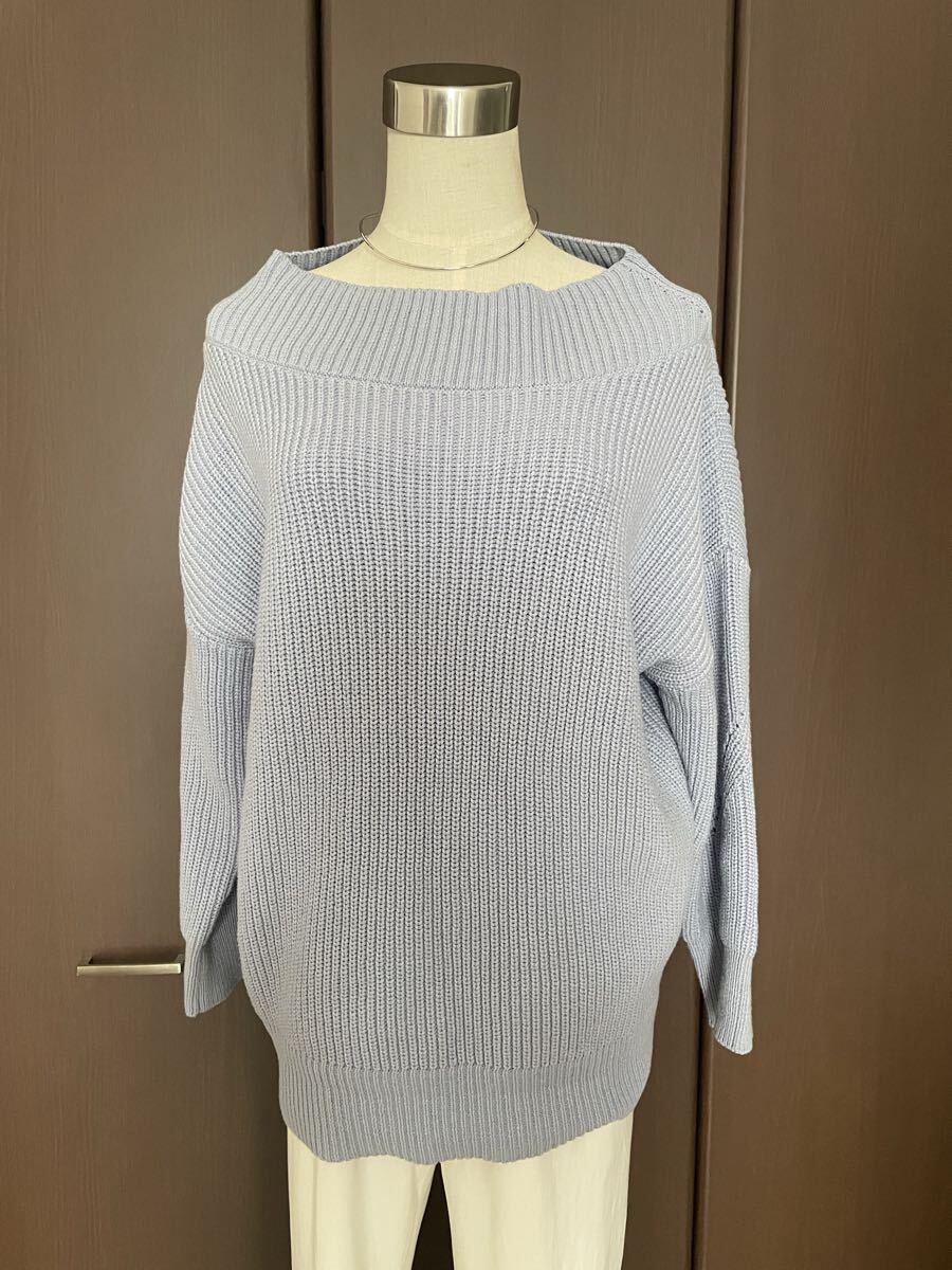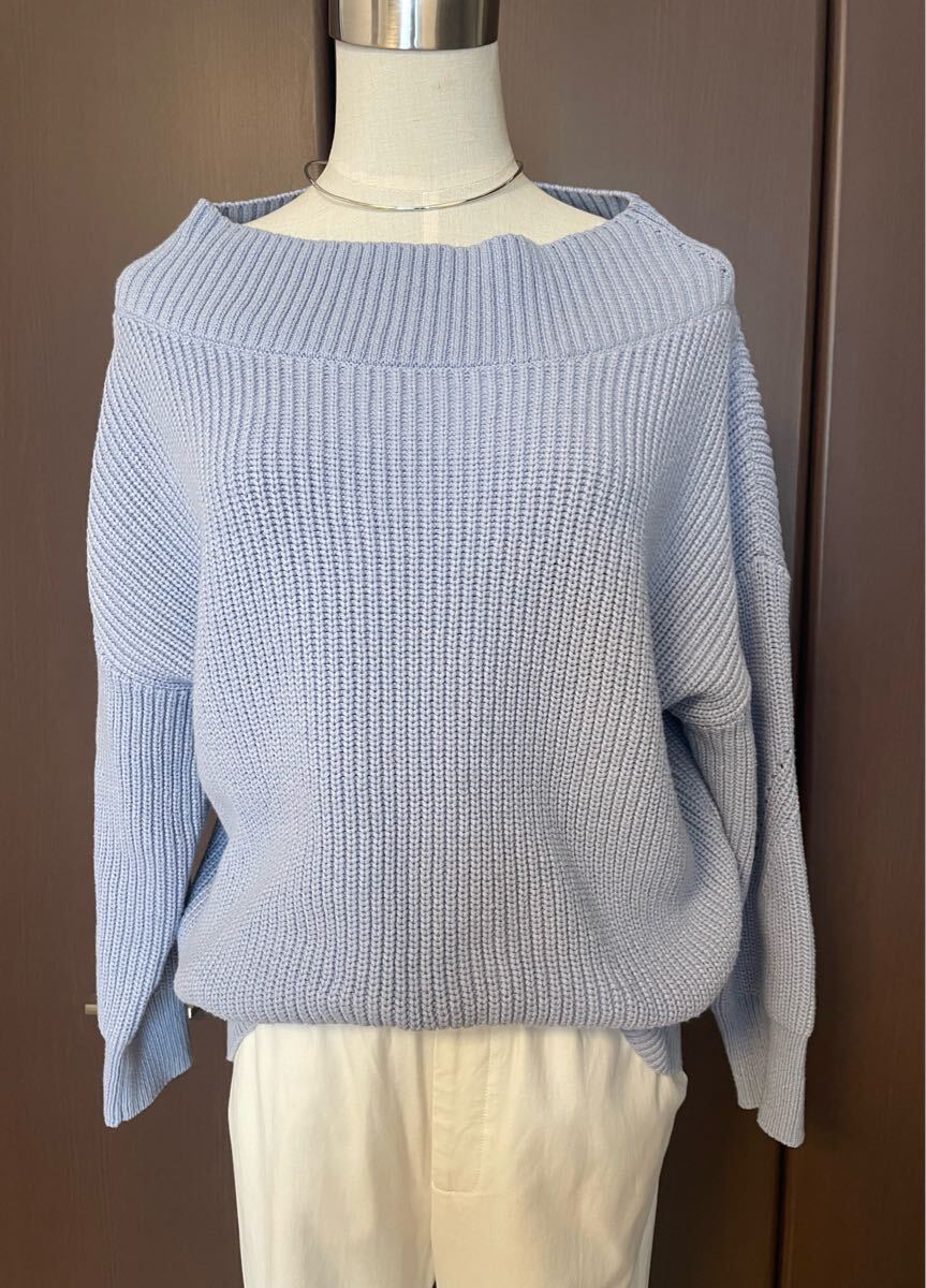 メルローズ リエス liesseのボートネックニットです。青みのある薄紫系、サルピアブルー色。サイズ表記なし、9〜11号くらい。素材は、綿・ナイロン。幅約50㎝、丈約60.5㎝。長袖ですが丈少し短め。ざっくりした編み目、オフショルダーでも通常のニットとしても着用可。数回着用してます、気になる方はご遠慮ください。商品以外のアクセサリー・インナー・ボトムは含まれません。