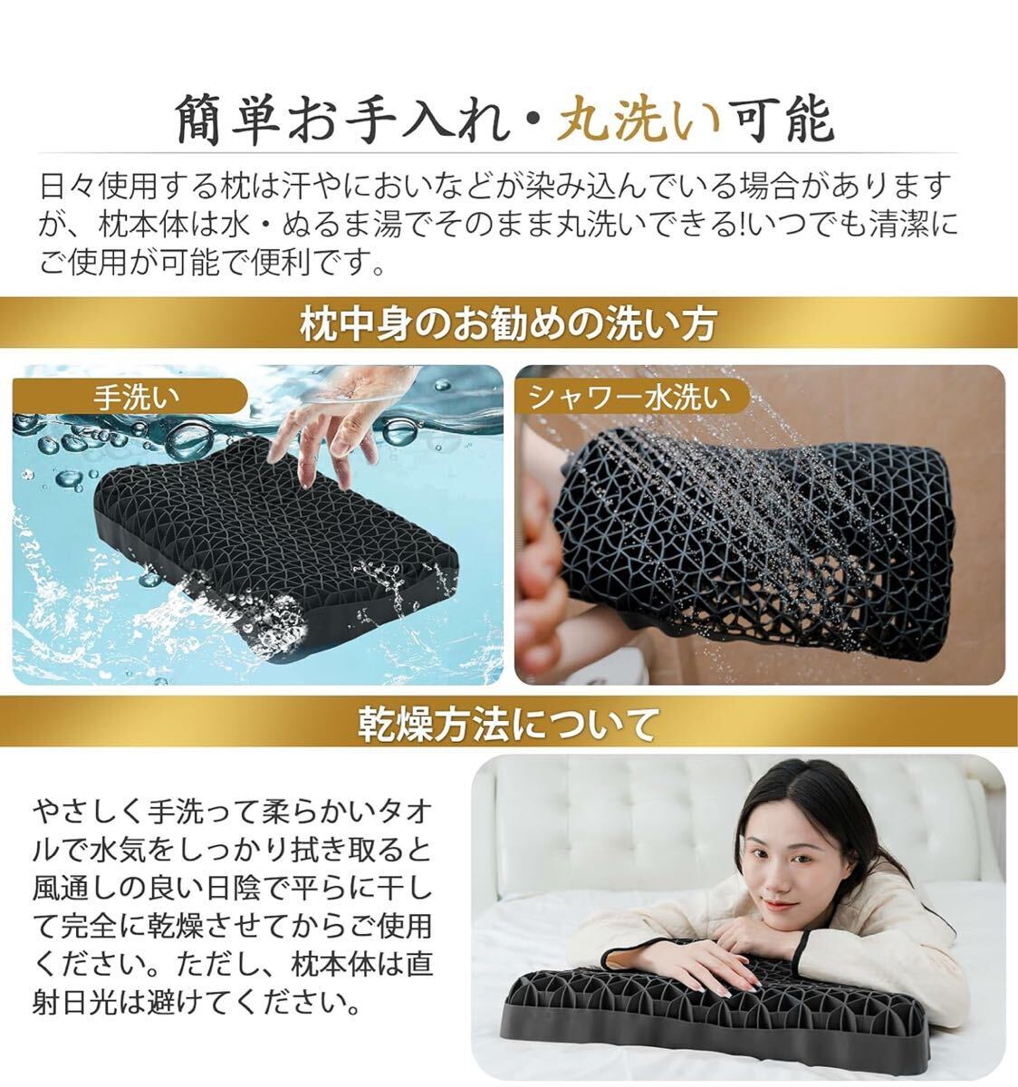【お手入れが簡単な洗える枕&高品質枕カバー付き】枕本体は水・ぬるま湯でやさしく手洗ってタオルで水気を拭き取り、風通しの良い日陰で平らに干して完全に乾燥させてからご使用ください(※直射日光は避けてください)。付属のプレミアム枕カバーは通気性に優れた高級素材使用、ファスナー式で洗濯機対応が可能です。衛生的な睡眠環境を簡単に維持できます。