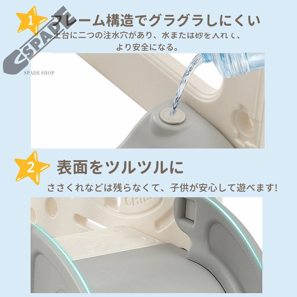 • 【安全面への細かいこだわり】01フレーム構造でグラグラしにくい。 土台に二つの注水穴があり、水または砂を入れて、より安全になる。 02表面をツルツルに ささくれなどは残らなくて、子供が安心して遊べます。 03角丸加工 不意にけがをしないよう細かいところまで配慮しています。角は丸く加工することで安全性を高めました。 04高品質の材料を使用 エコ・無毒・安全のHDPEを採用する。